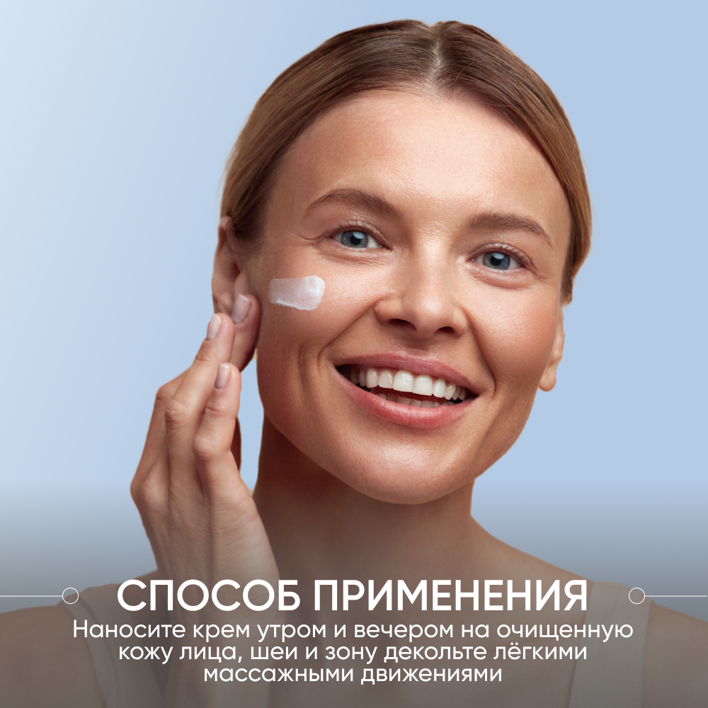 | Способ применения | Небольшое количество средства нанесите на чистую кожу лица и область декольте. Дайте крему хорошо впитаться. |