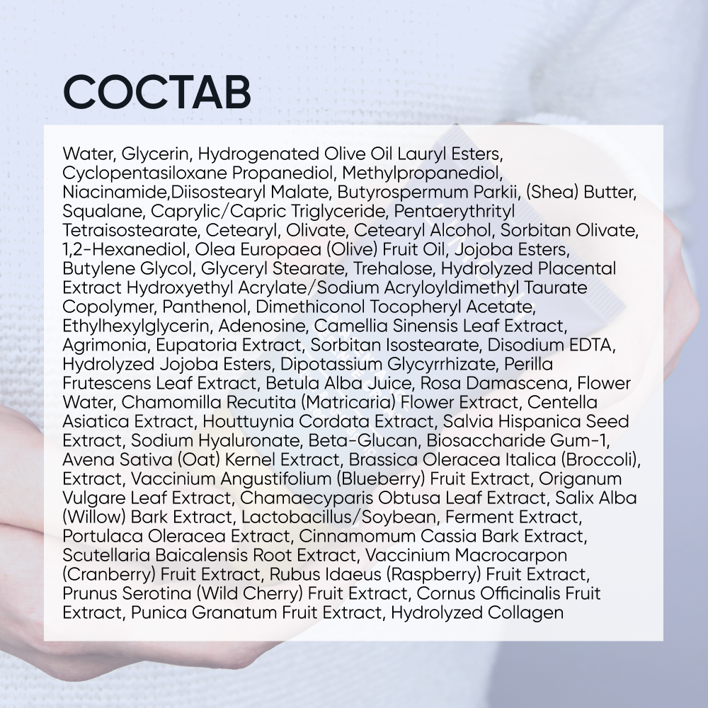 | Состав | Water, Glycerin, Hydrogenated Olive Oil Lauryl Esters, Cyclopentasiloxane Propanediol, Methylpropanediol, Niacinamide,Diisostearyl Malate, Butyrospermum Parkii, (Shea) Butter, Squalane, Caprylic/Capric Triglyceride, Pentaerythrityl Tetraisostearate, Cetearyl, Olivate, Cetearyl Alcohol, Sorbitan Olivate, 1,2-Hexanediol, Olea Europaea (Olive) Fruit Oil, Jojoba Esters, Butylene Glycol, Glyceryl Stearate, Trehalose, Hydrolyzed Placental Extract Hydroxyethyl Acrylate/Sodium Acryloyldimethyl Taurate Copolymer, Panthenol, Dimethiconol Tocopheryl Acetate, Ethylhexylglycerin, Adenosine, Camellia Sinensis Leaf Extract, Agrimonia, Eupatoria Extract, Sorbitan Isostearate, Disodium EDTA, Hydrolyzed Jojoba Esters, Dipotassium Glycyrrhizate, Perilla Frutescens Leaf Extract, Betula Alba Juice, Rosa Damascena, Flower Water, Chamomilla Recutita (Matricaria) Flower Extract, Centella Asiatica Extract, Houttuynia Cordata Extract, Salvia Hispanica Seed Extract, Sodium Hyaluronate, Beta-Glucan, Biosaccharide Gum-1, Avena Sativa (Oat) Kernel Extract, Brassica Oleracea Italica (Broccoli), Extract, Vaccinium Angustifolium (Blueberry) Fruit Extract, Origanum Vulgare Leaf Extract, Chamaecyparis Obtusa Leaf Extract, Salix Alba (Willow) Bark Extract, Lactobacillus/Soybean, Ferment Extract, Portulaca Oleracea Extract, Cinnamomum Cassia Bark Extract, Scutellaria Baicalensis Root Extract, Vaccinium Macrocarpon (Cranberry) Fruit Extract, Rubus Idaeus (Raspberry) Fruit Extract, Prunus Serotina (Wild Cherry) Fruit Extract, Cornus Officinalis Fruit Extract, Punica Granatum Fruit Extract, Hydrolyzed Collagen |