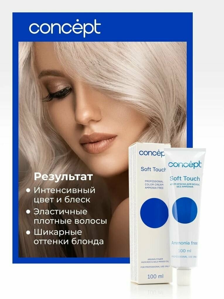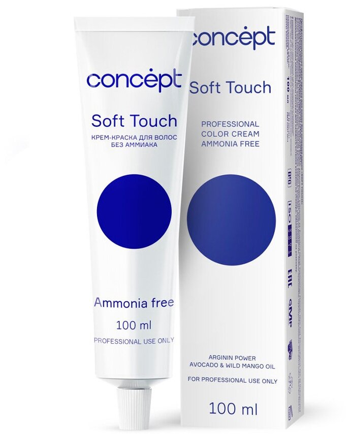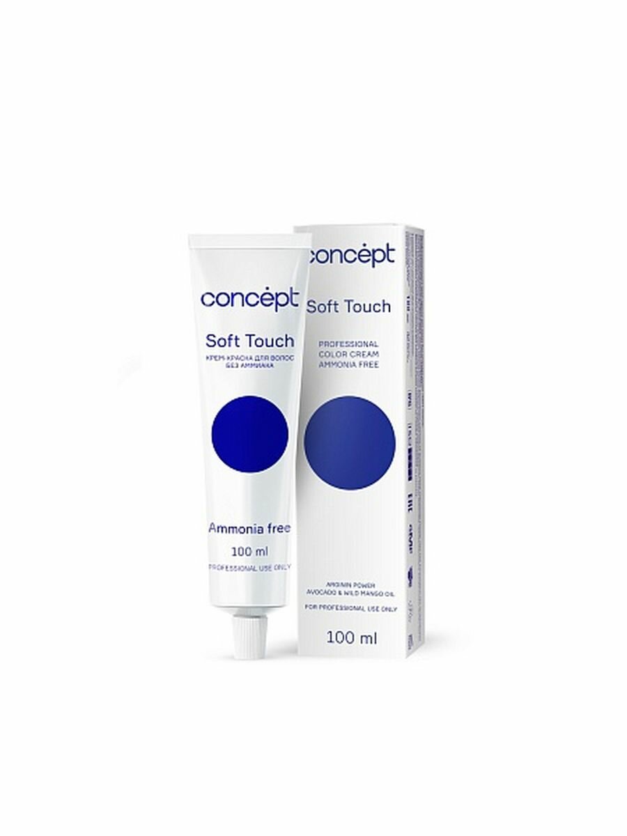 Крем-краска CONCEPT Soft Touch - стойкое безаммиачное окрашивание. Безаммиачные красители Soft Touch позволяют объединять в одной процедуре окрашивание и уход. Краска содержит триэтаноламин - регулятор рН - обеспечивающий эффективность всех компонентов, входящих в состав крем-краски - аргинин, льняное масло, кондиционирующие добавки, придающие волосам шелковистость, эластичность и блеск.