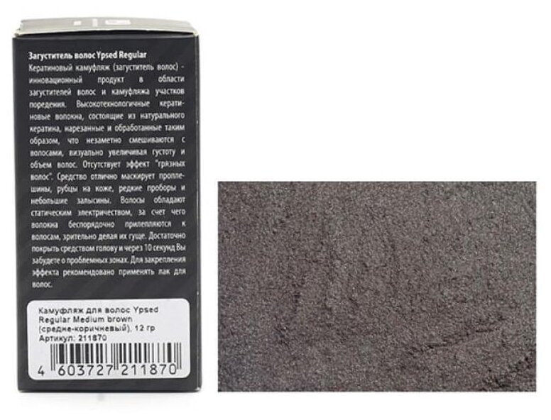 Кератиновый камуфляж (загуститель) волос YPSED серия Regular это высокотехнологичные кератиновые волокна, состоящие из натурального кератина, нарезанные и обработанные таким образом, что они незаметно смешиваются с волосами, визуально увеличивая густоту и объем. Используя загуститель, достаточно просто превратить жидкие прядки в густую шевелюру. Средство отлично маскирует проплешины, рубцы на коже, редкие проборы, небольшие залысины. Продукт выпускается в разных оттенках, поэтому подобрать загуститель можно к любому натуральному цвету волос. Волосы обладают статическим электричеством, за счет этого волокна беспорядочно прилепляются к волосам, зрительно делая их гуще. Достаточно покрыть средством голову и через 10 секунд оценить результат: проблемных зон не будет видно. Плюсом сухого загустителя является то, что это очень быстрый и наипростейший способ скрыть дефект прически, средство можно взять с собой в поездку и пользоваться им в любых обстоятельствах. Волокна достаточно хорошо прикрепляются к волосам, но все же специалисты рекомендуют дополнительно применять фиксирующие средства (спрей-фиксатор Ypsed или лак для волос), чтобы еще сильнее закрепить загуститель. Подходит для применения как мужчинам так и женщинам, помогает в любой ситуации выглядеть достойно и чувствовать себя уверенно.