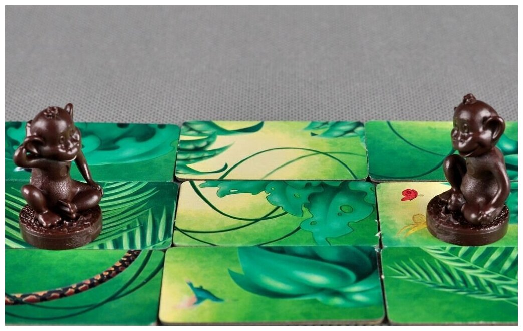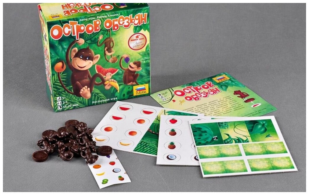 | Комплект игры | 8 фигурок обезьян, 9 вырубных фишек лиан, 24 фишки фруктов, правила игры |