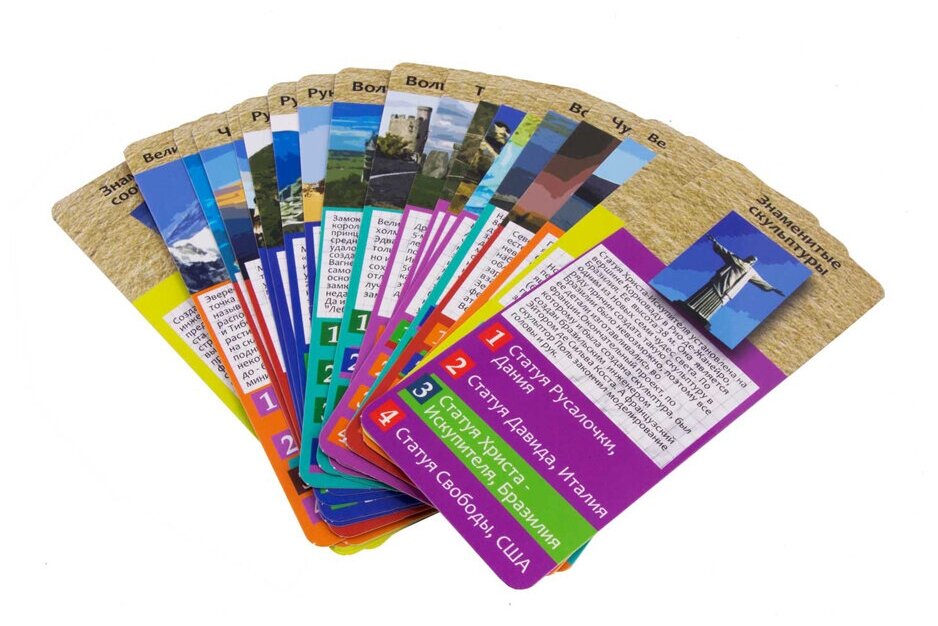 В комплекте 41 карта: 40 игральных карт и 1 карта-инструкция. На каждой игральной карте изображена одна из достопримечательностей мира, а также уникальные исторические факты об этой достопримечательности. Карты разбиты на серии: древнейшие ворота городов мира, крупнейшие водопады, крупнейшие реки, знаменитые скульптуры, знаменитые сооружения, величественные горы, чудеса природы, рукотворные чудеса, волшебные замки, тайны природы. В каждую серию входит 4 карты.