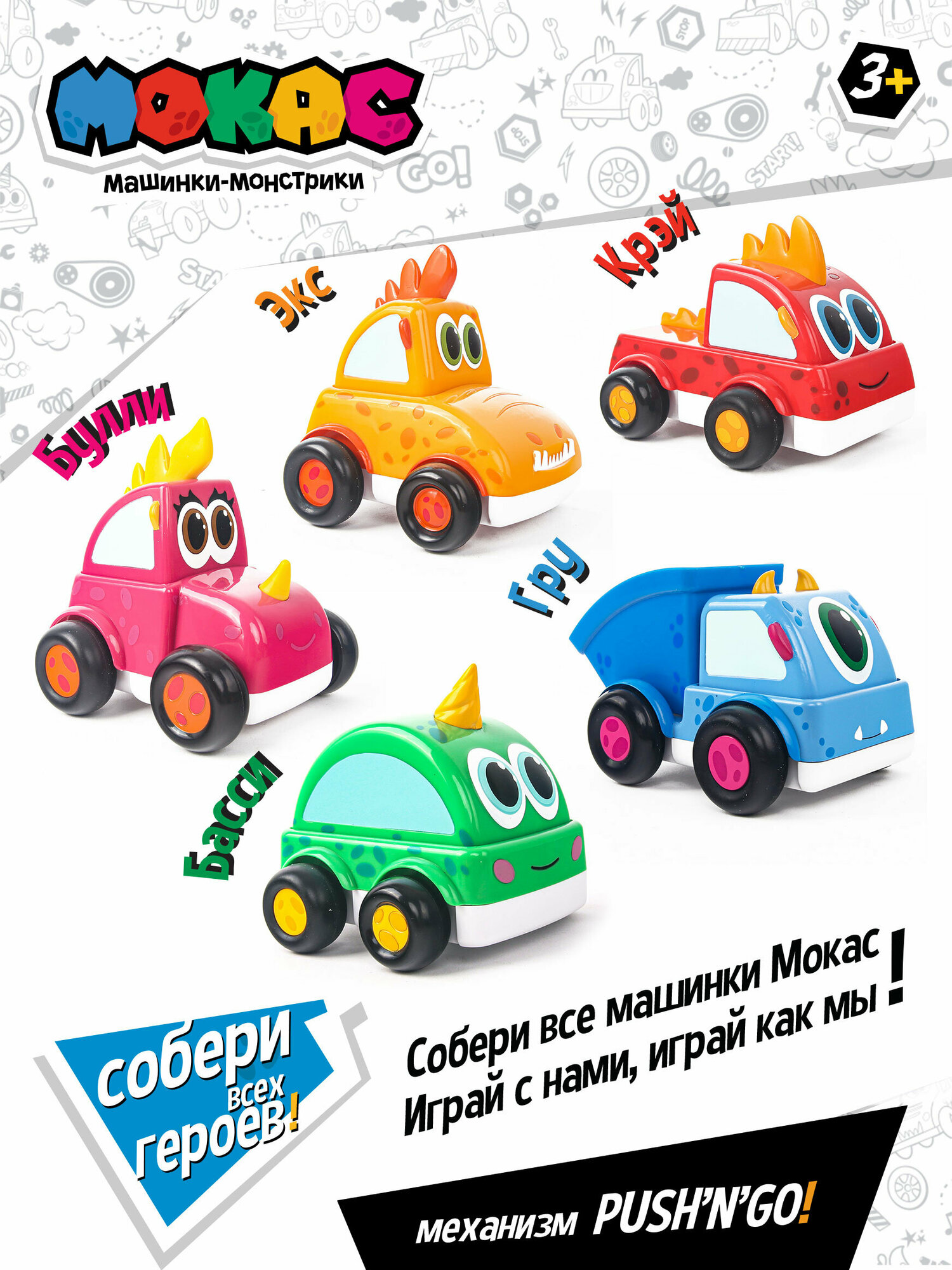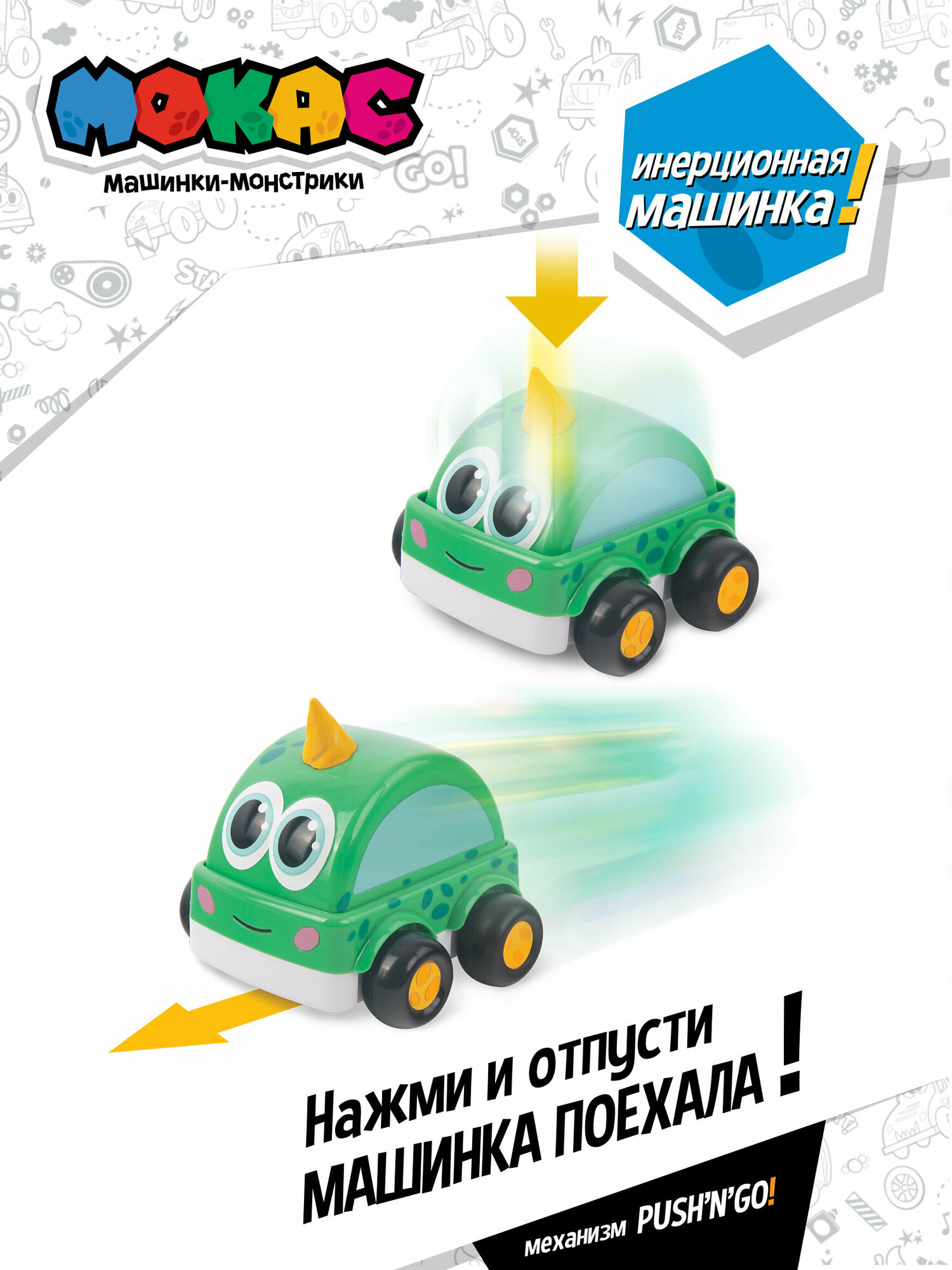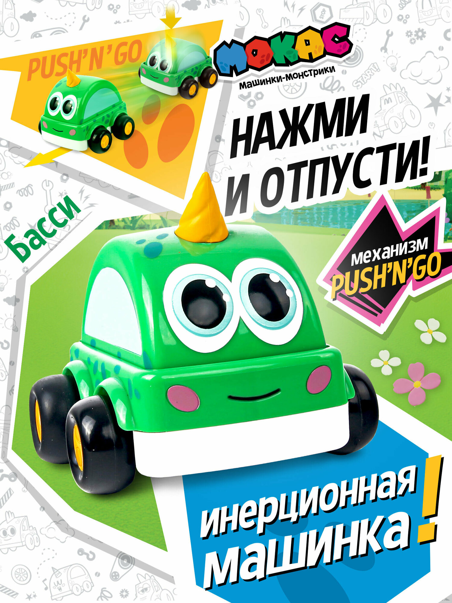 Инерционная машинка - монстрик Басси, выполненная в виде героя популярного мультфильма Мокас, оснащена инерционным механизмом Push'n'Go, позволяющим с легкостью запустить машинку даже самому маленькому ребенку. Для этого достаточно нажать на подвижную верхнюю часть машинки и она поедет. При этом скорость машинки будет не очень большая и малышу будет просто за ней уследить. Корпус машинки выполнен из прочного ABS пластика, а выступающие части из мягкого PVC. Это позволяет снизить возможность получения ребенком травмы. Весь пластик, из которого произведена игрушка, является безопасным и гипоаллергенным.