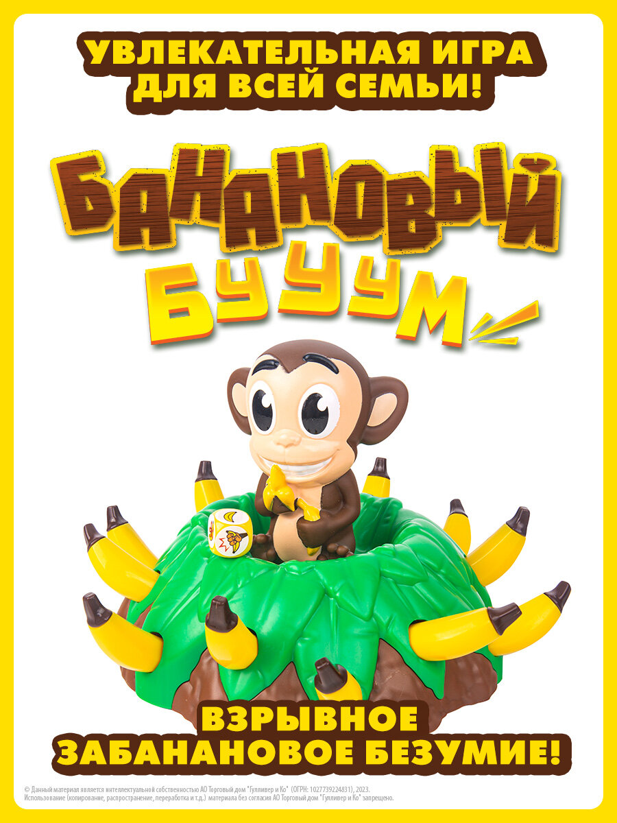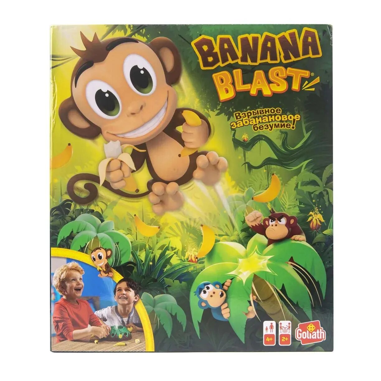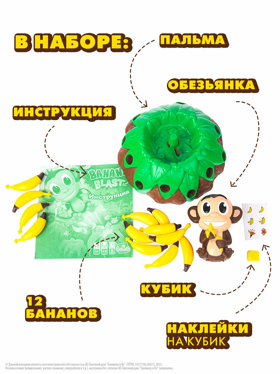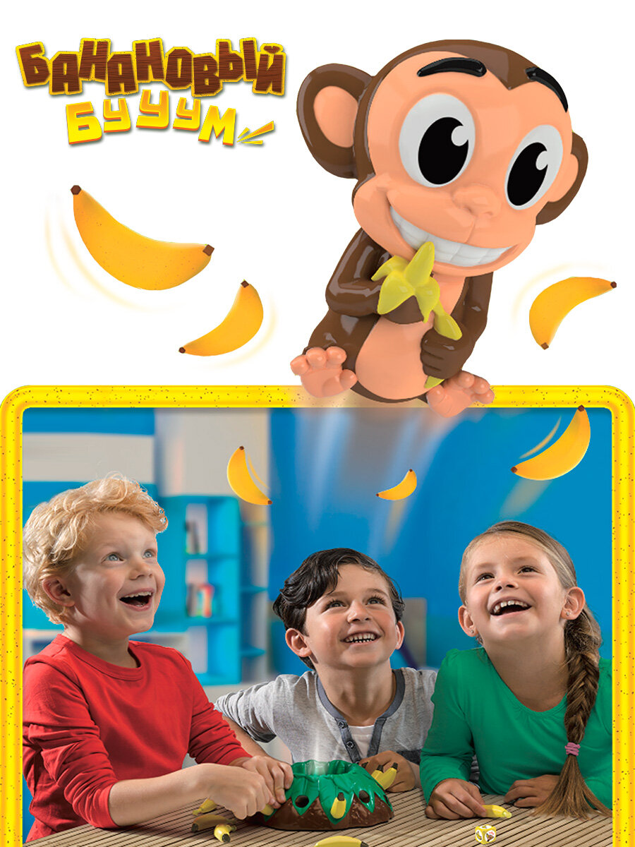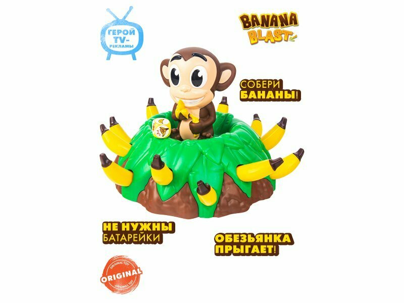 Banana blast (Банановый бууум) - увлекательная игра с нарастающим волнением и элементом неожиданности! Тренирует ловкость и координацию. Отличный подарок для детей от 4-х лет. Игра подходит для компании от 2-х до 5-ти человек. Легкая сборка. Элементы игры изготовлены из безопасного для детей, ударопрочного АБС-пластика.