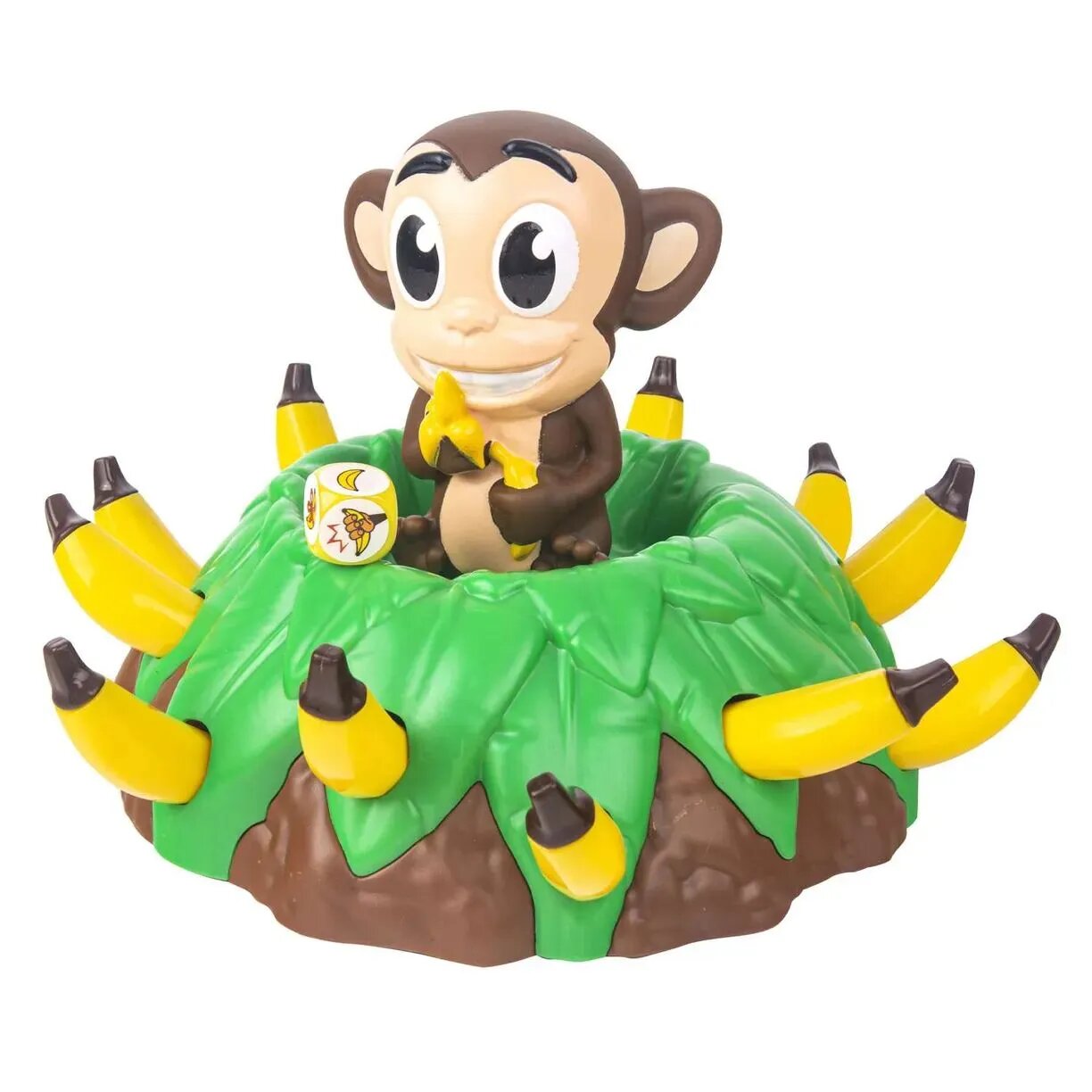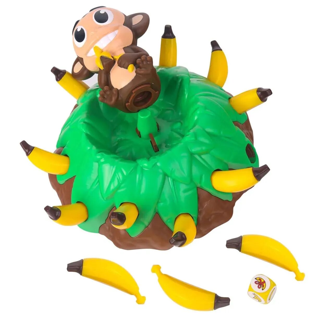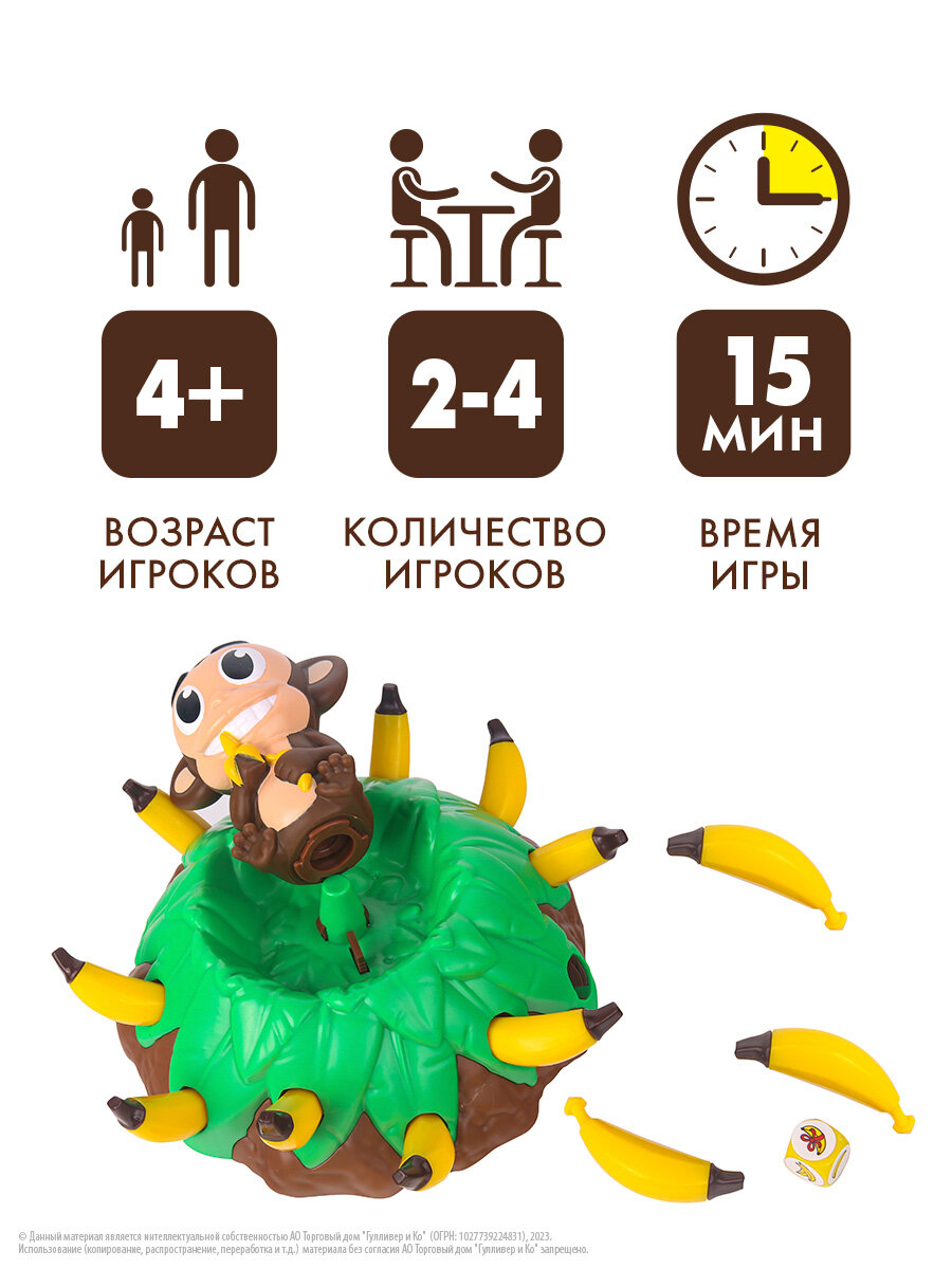 Веселая обезьянка живет на пальме с бананами! Попробуйте забрать эти бананы! Бросайте кубик. Посмотрите сколько бананов нужно снять с пальмы. Собирайте их очень аккуратно, обезьянка может прыгнуть в любой момент! Проверьте свою ловкость и поймайте ее! За пойманную обезьянку игрок получает дополнительные бананы. Выигрывает тот, кто соберет больше всех бананов.