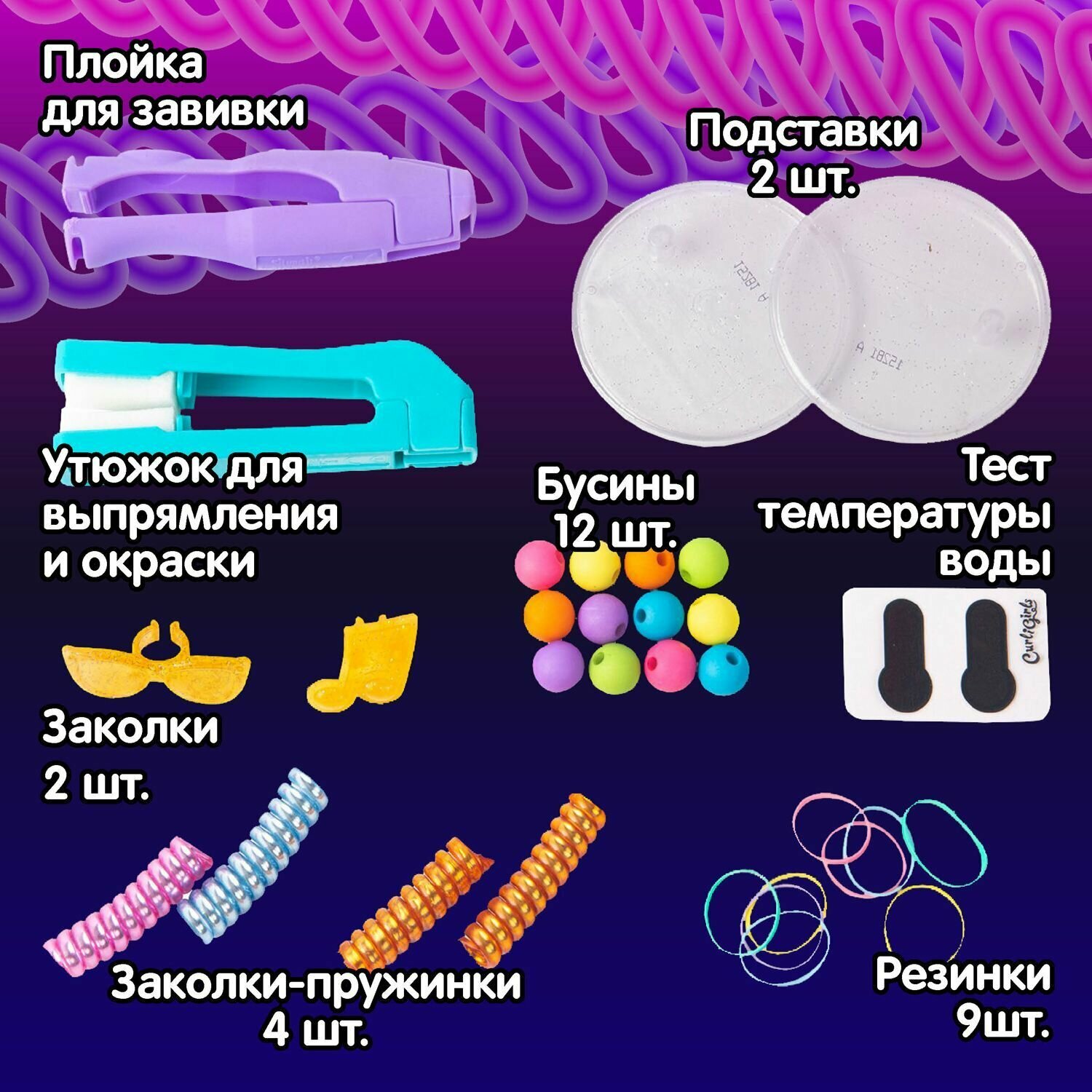 Игрушка из пластмассы, в наборе, с маркировкой “Silverlit”, “Curli Girls”. В набор входят: кукла – 2 шт., фигурка питомца - 1 шт., зажим для завивки – 1 шт., выпрямитель - 1 шт., индикатор температуры – 1 шт., бусинки – 12 шт., заколка – 2 шт., спиральки для волос - 4 шт., резинки для прядей - 9 шт., подставка для куклы – 2 шт., инструкция – 1 шт.