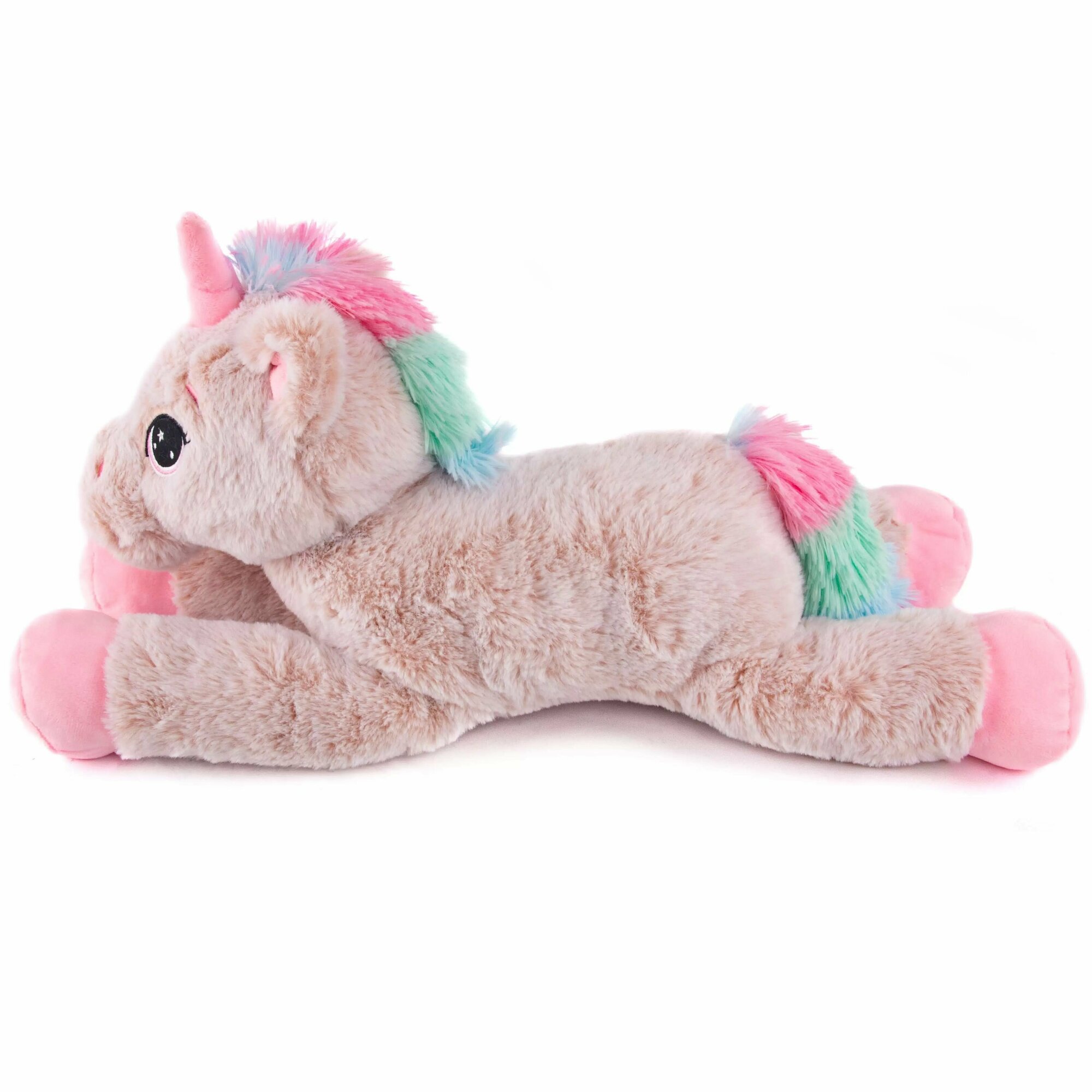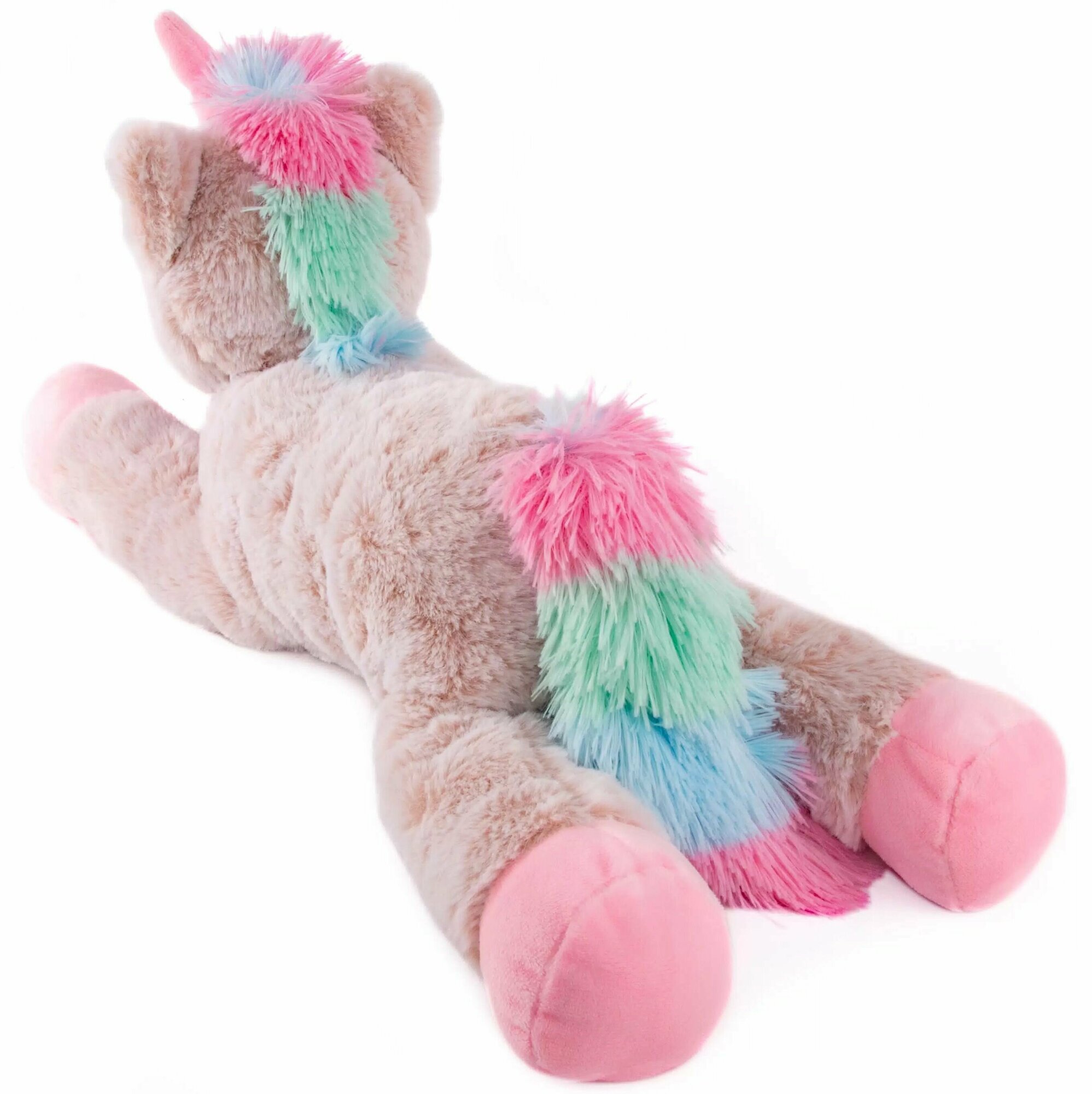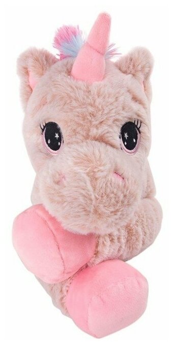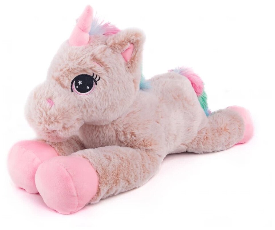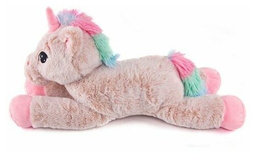 Лежачий единорог пастельного бежевого оттенка с разноцветной гривой и хвостиком, и мягким нежным мехом будет оценен по достоинству каждым ребенком. Его очень приятно держать в руках или гладить по мягкой шерстке. Игрушка изготовлена из качественных безопасных материалов.