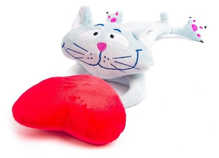 Очаровательный котик нежно-голубого цвета с милым выражением мордочки понравится и взрослому и ребенку. В лапках у котика сердечко, поэтому игрушка станет отличным подарком к любому празднику для самых близких людей. Благодаря вытянутому телу и мягким приятным на ощупь материалам, игрушку можно использовать в качестве подушки или оригинального предмета интерьера. Игрушку также можно взять с собой в дорогу в машину, поезд или самолет. Вся отделка выполнена вышивкой. Изготовлена из сертифицированных материалов высокого качества.