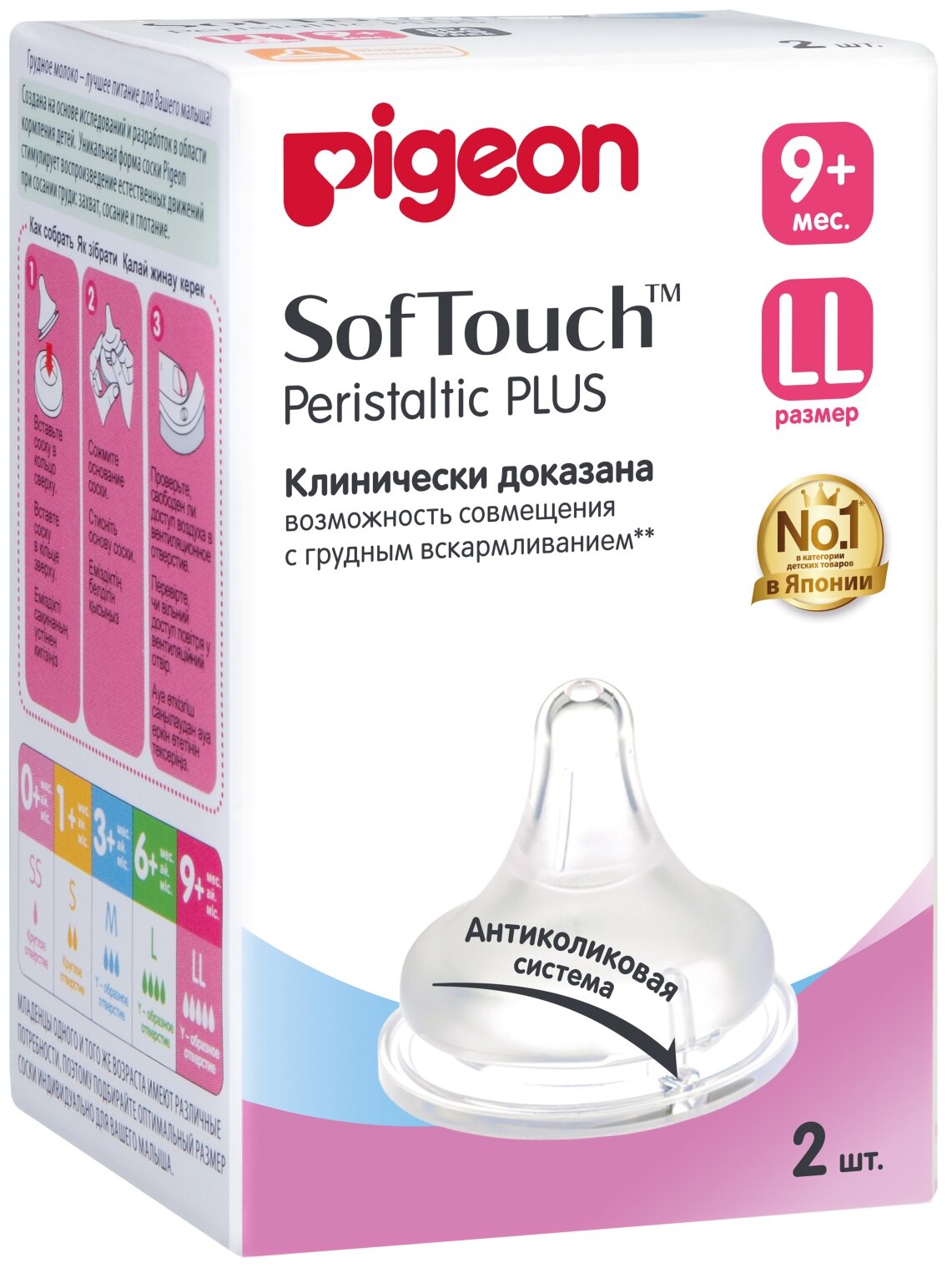Соска силиконовая для детской бутылочки Pigeon SofTouch Peristaltic PLUS размер LL ( 9+ мес.), 2шт