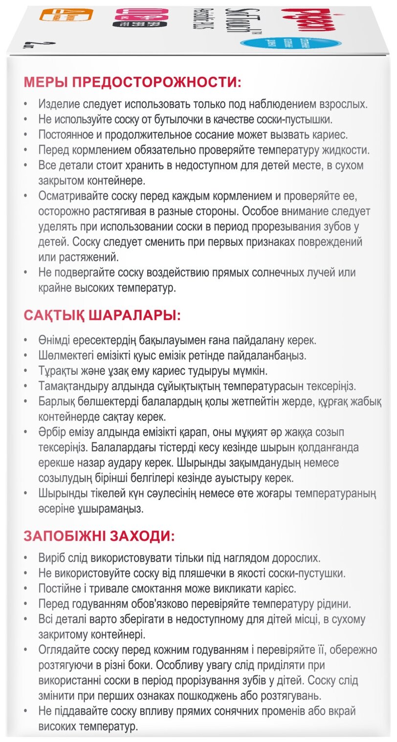 Соска изготовлена из очень мягкого, эластичного и плотного силикона, уникальная конструкции соски стимулирует естественное сосание. Матовая текстурированная поверхность способствует надежному захвату соски. Размер LL (9 мес.+).