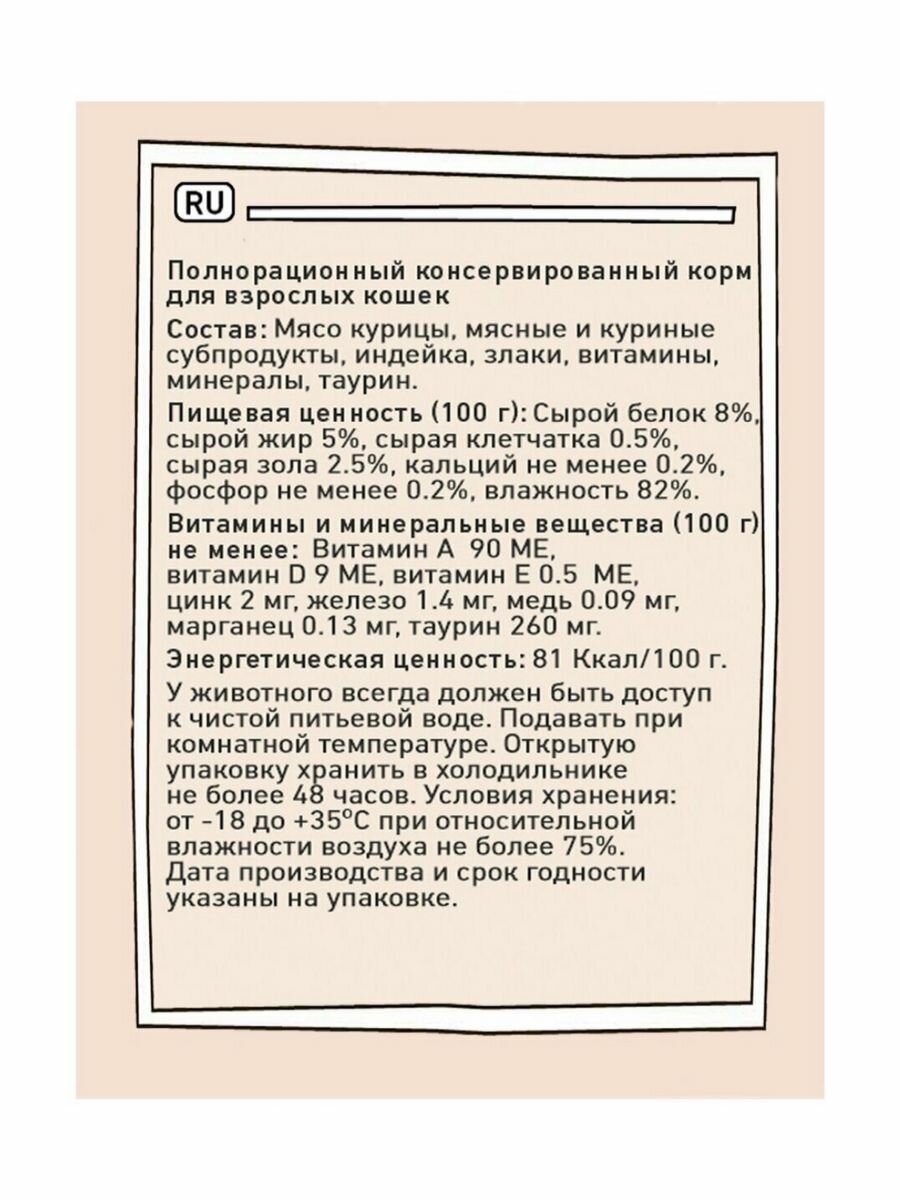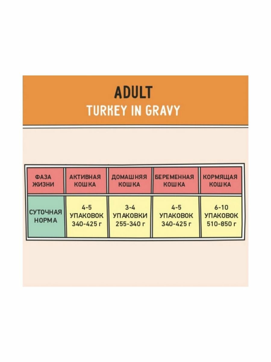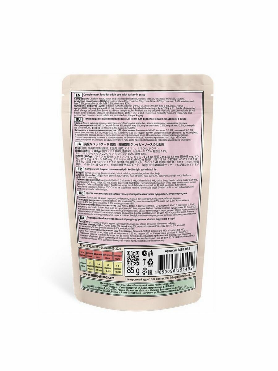 Полнорационный консервированный корм для взрослых кошек Индейка в соусе. Полнорационный влажный корм ZILLII ADULT CAT with Turkey in gravy обеспечивает потребность кошек в питательных веществах, благодаря балансу кальция и фосфора в составе корма поддерживает здоровье опорно-двигательного аппарата. Рецептура изготовлена с использованием очень полезного для кошек диетического мяса, богатого содержанием таурина и витаминов – мяса индейки. Содержащийся в индейке натрий помогает пополнить объемы плазмы в крови и обеспечить нормальные обменные процессы. Основа рецептуры - натуральные ингредиенты. Оптимальное количество таурина, содержащееся в рецептуре ZILLII ADULT CAT with Turkey in gravy положительно влияет на работу сердечной мышцы