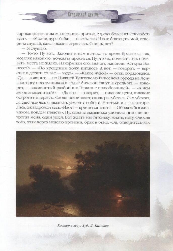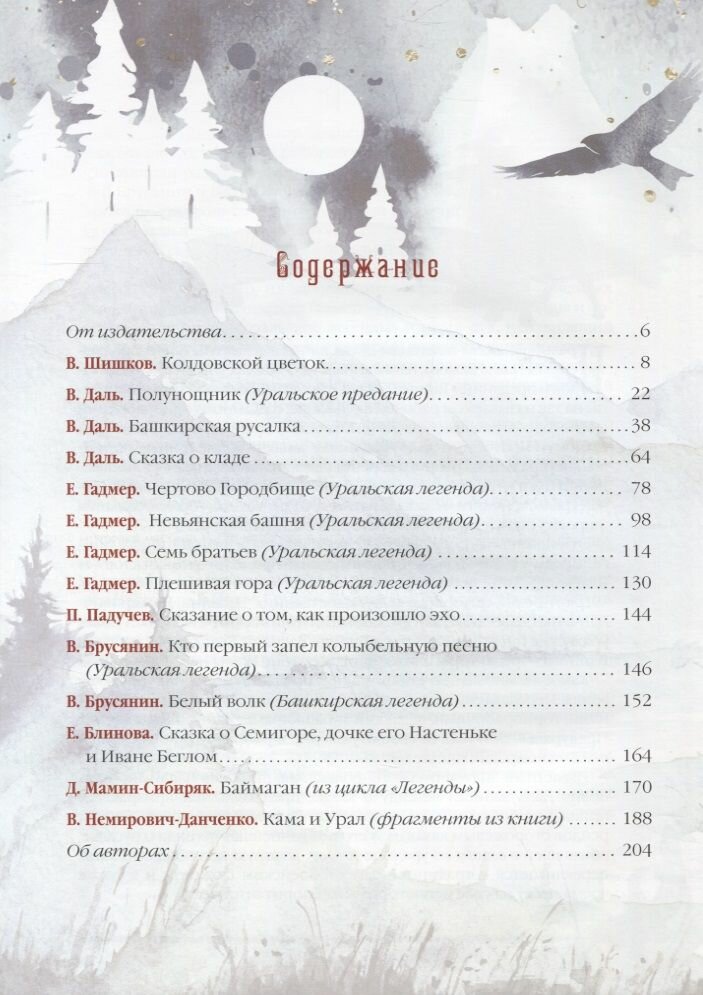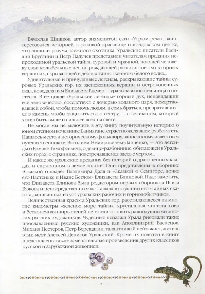 Но уральская земля рождала и иные таинственные предания: легенды могучей уральской тайги и сказы, связанные с Уральскими горами, сказания бескрайних степей Предуралья, исторический фольклор. Их собирали многие прославленные писатели: филолог и фольклорист Владимир Даль, создатель саги "Угрюм-река" Вячеслав Шишков, литератор и путешественник Василий Немирович-Данченко, автор "Серой шейки" и "Аленушкиных сказок" Дмитрий Мамин-Сибиряк, а также другие певцы сокровищ Уральской земли.