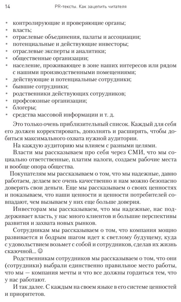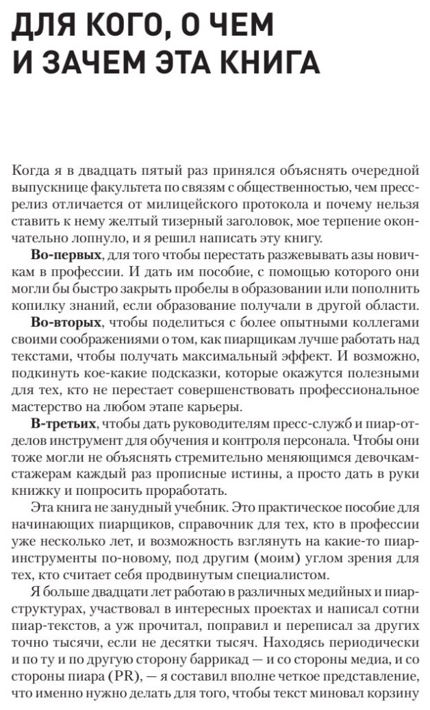 Книга подойдет руководителем и сотрудникам пресс-служб, PR-отделов и PR-департаментов; пресс-секретарям и специалистам по связям с общественностью; сотрудникам PR-агентств и фрилансерам, занимающимся продвижением клиентов; новичкам в профессии и тем, кто только готовится посвятить себя карьере в области PR.