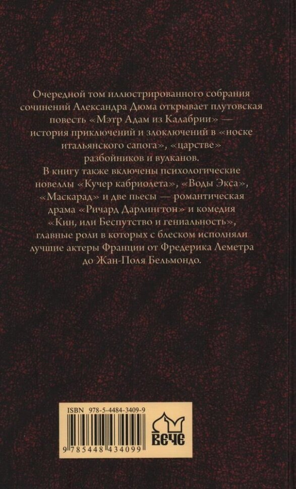 Очередной том иллюстрированного собрания сочинений Александра Дюма открывает плутовская повесть «Мэтр Адам из Калабрии» — история приключений и злоключений в «носке итальянского сапога», «царстве» разбойников и вулканов.