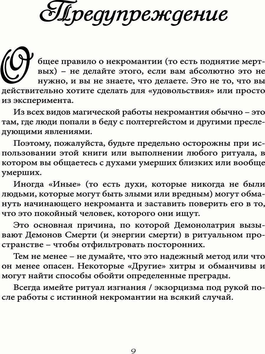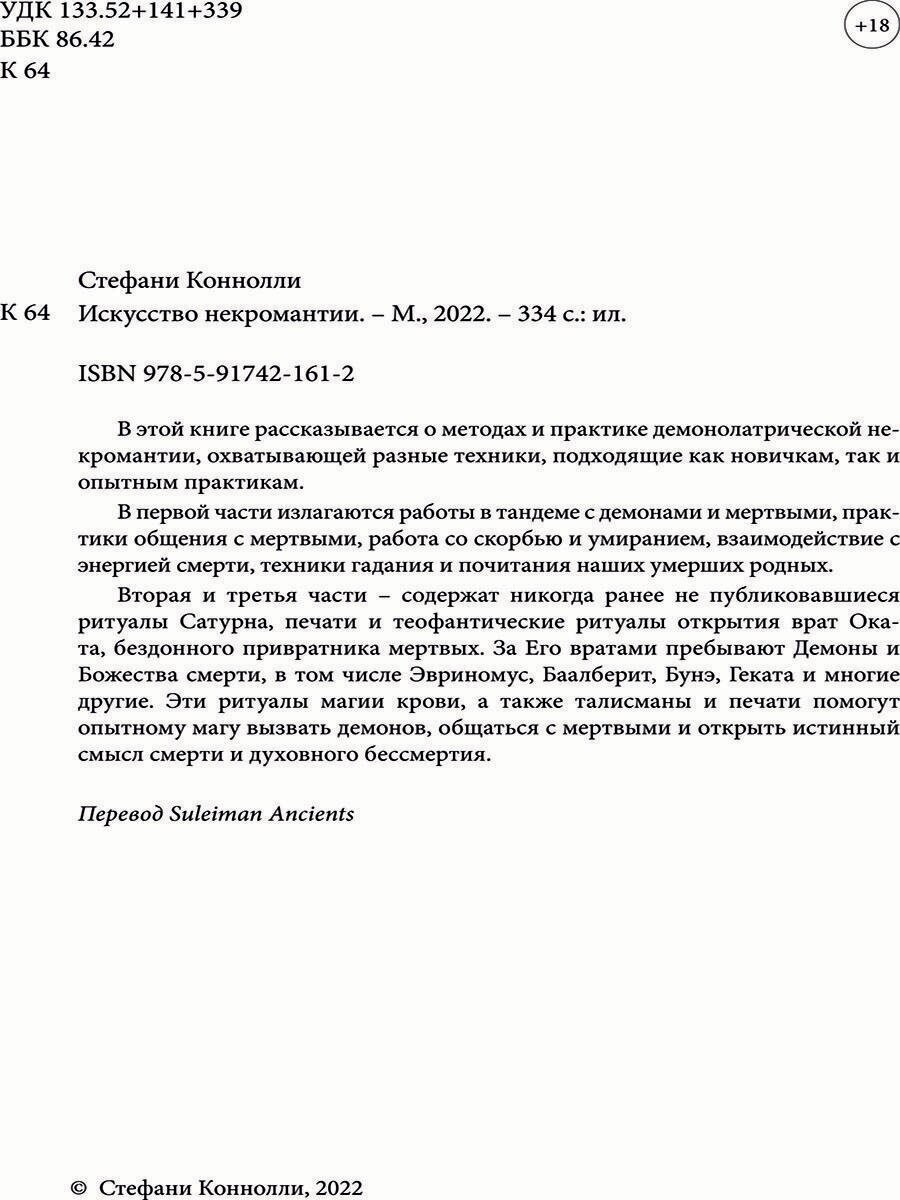 В этой книге рассказывается о методах и практике демонолатрической некромантии, охватывающей разные техники, подходящие как новичкам, так и опытным практикам. В первой части излагаются работы в тандеме с демонами и мертвыми, практики общения с мертвыми, работа со скорбью и умиранием, взаимодействие с энергией смерти и техники гадания и почитания наших родных умерших. Вторая и третья часть книги раскрывает никогда ранее не публиковавшиеся ритуалы Сатурна, печати и теофантические ритуалы открытия врат Оката, бездонного привратника мертвых. За Его вратами пребывают Демоны и Божества смерти, в том числе Эвриномус, Баалберит, Бунэ, Геката и многие другие. Эти ритуалы магии крови, а также талисманы и печати помогут опытному магу вызвать демонов, общаться с мертвыми и открыть истинный смысл смерти и духовного бессмертия.