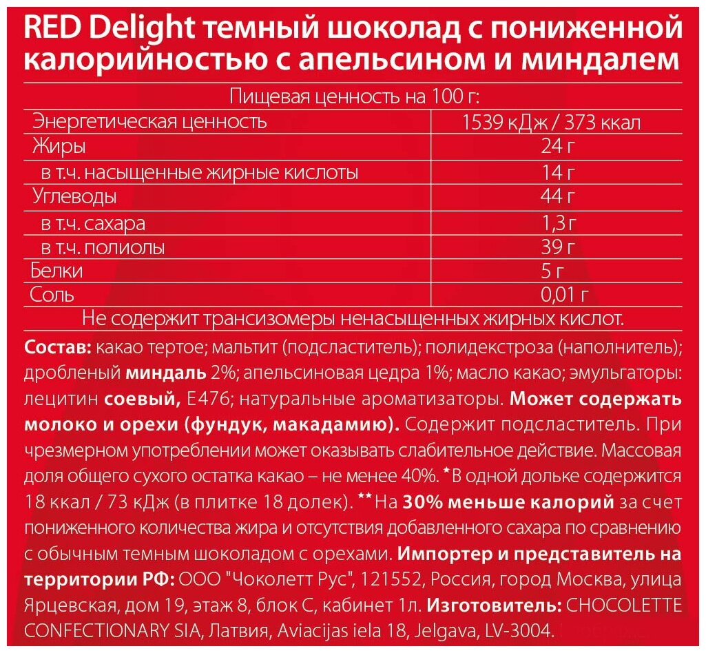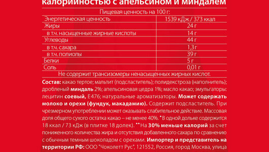 | Состав | Какао тертое; мальтит (подсластитель); полидекстроза (наполнитель); дробленый миндаль 2%; апельсиновая цедра 1%; масло какао; эмульгаторы: лецитин соевый, Е476; натуральные ароматизаторы. Может содержать молоко и орехи (фундук, макадамию). Содержит подсластитель. При чрезмерном употреблении может оказывать слабительное действие. Массовая доля общего сухого остатка какао - не менее 40%. *В одной дольке содержится 18 ккал - 73 кДж (в плитке 18 долек). |