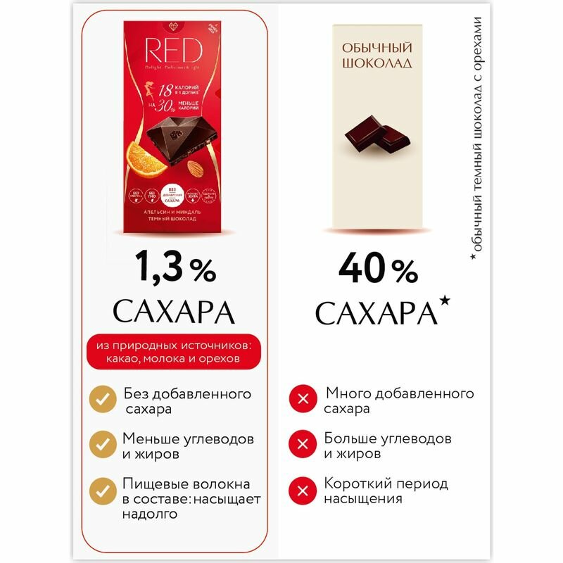 ПП продукты RED Delight - отличный выбор для ЗОЖ, правильного и диетического питания: БЕЗ САХАРА, меньше калорий и углеводов, без пальмового масла, без глютена, подходят для кето-диеты. Полезные и здоровые сладости! Изысканный темный шоколад с кусочками средиземноморского апельсина и калифорнийского миндаля. Яркий насыщенный вкус для ценителей темного шоколада.