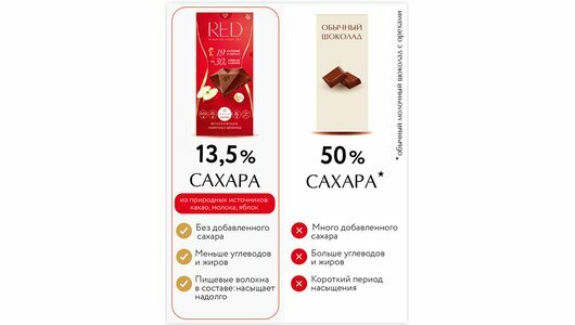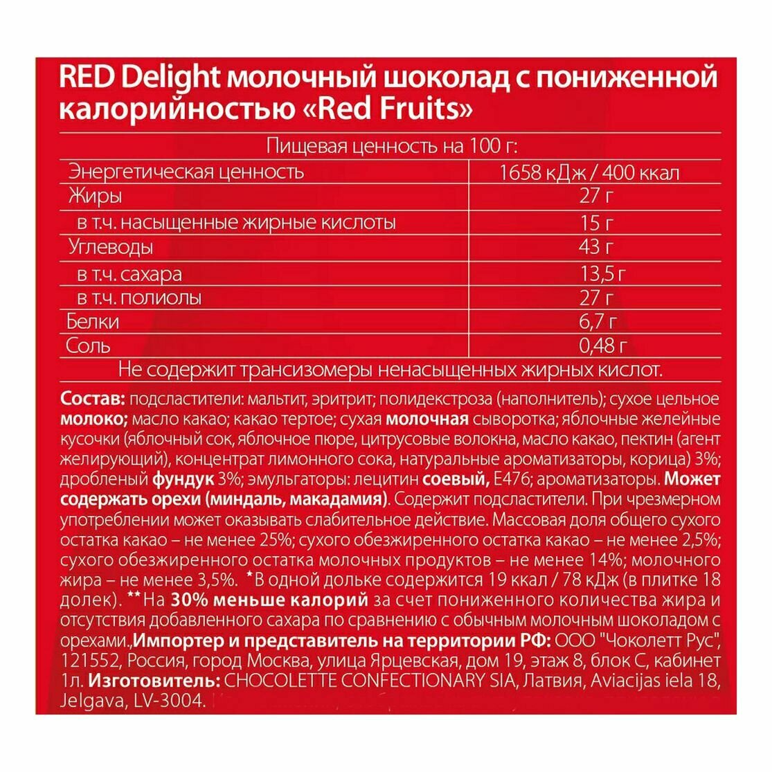 ПП продукты RED Delight - отличный выбор для ЗОЖ, правильного и диетического питания: БЕЗ САХАРА, меньше калорий и углеводов, без пальмового масла, без глютена. Полезные и здоровые сладости! RED - легкий и вкусный шоколад без сахара. Какао-бобы из Кот-дИвуара и отборное молоко придают нашему шоколаду восхитительный сливочный вкус и нежную текстуру. Дополнительные оттенки обеспечивают приятная кислинка яблока и хрустящий фундук.