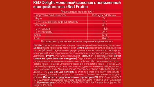 Изготовлен в Европе: шоколад RED изготавливает швейцарская компания Chocolette Confectionary на своей новой фабрике в Латвии. Качество шоколада гарантировано сертификатом BRC, признанным в 30 странах мира.