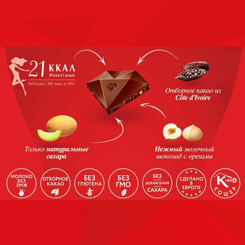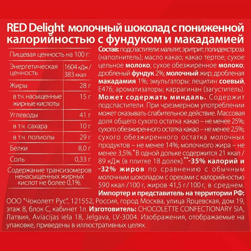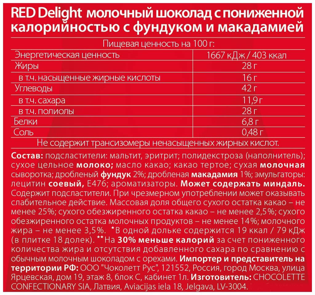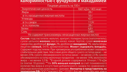 | Состав | Подсластители: мальтит, эритрит; полидекстроза (наполнитель); сухое цельное молоко; масло какао; какао тертое; сухая молочная сыворотка; дробленый фундук 2%; дробленая макадамия 1%; эмульгаторы: лецитин соевый, Е476; ароматизаторы. |