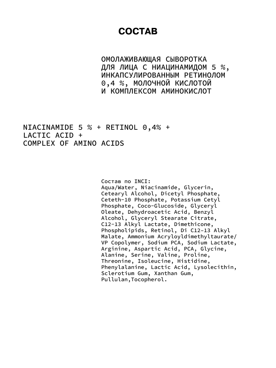 Состав: aqua/water, niacinamide, glycerin, cetearyl alcohol, dicetyl phosphate, ceteth-10 phosphate, potassium cetyl phosphate, coco-glucoside, glyceryl oleate, dehydroacetic acid, benzyl alcohol, glyceryl stearate citrate, c12-13 alkyl lactate, dimethicone, phospholipids, retinol, di c12–13 alkyl malate, ammonium acryloyldimethyltaurate/vp copolymer, sodium pca, sodium lactate, arginine, aspartic acid, pca, glycine, alanine, serine, valine, proline, threonine, isoleucine, histidine, phenylalanine, lactic acid, lysolecithin, sclerotium gum, xanthan gum, pullulan,tocopherol.