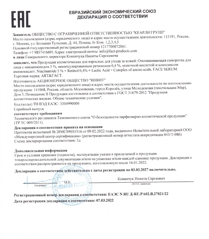Art&Fact Омолаживающая сыворотка для лица Niacinamide 5% + Retinol 04% 30 мл (Art&Fact ) (ЭХ99989431682)