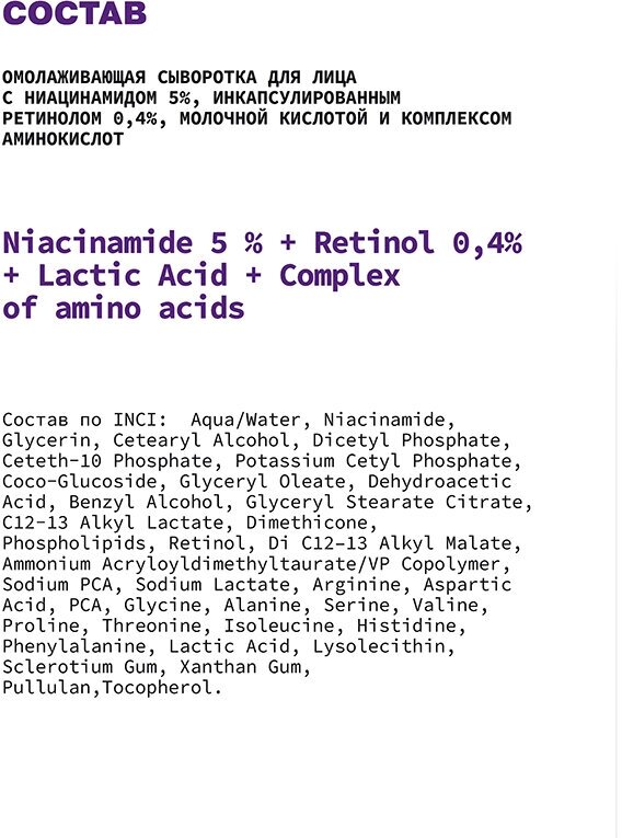 Сыворотка с ниацинамидом, ретинолом, молочной кислотой и комплексом аминокислот. Ниацинамид эффективно борется с морщинами, выравнивая кожу и улучшая ее эластичность. Инкапсулированный ретинол в эффективной концентрации повышает регенерацию кожи, борется с воспалениями и черными точками, признаками фотостарения, улучшает текстуру кожи и разглаживает мелкие морщинки. Для всех типов кожи.