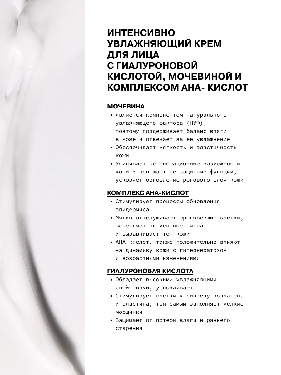 Крем для лица с гиалуроновой кислотой, мочевиной и комплексом AHA- кислот. Глубокое увлажнение кожи за счет синергирующего действия гиалуроновой кислоты и мочевины. Идеален для обезвоженной кожи. Легкий, некомедогенный. Подходит для постпилингового ухода. Для всех типов кожи.