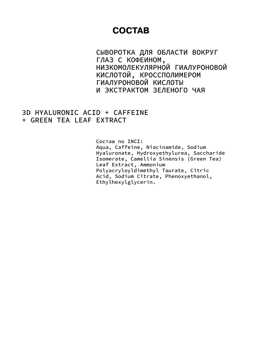Состав: aqua/water, caffeine, sorbitol, glycerin, propylene glycol, maltodextrin, dehydroacetic acid, benzyl alcohol,pentylene glycol, tamarindus indica seed extract, stevioside, propyl gallate, gallyl glucoside, epigallocatechin gallatyl glucoside, dimethyl isosorbide, butylene glycol, hydrolyzed wheat protein,disodium edta, hydroxyethylcellulose,sodium hyaluronate, methylsulphonylmethane, xanthan gum, sodium hyaluronate crosspolymer, sodium acetylated hyaluronate, hydrolyzed sodium hyaluronate, pentylene glycol, ethylhexylglycerin.