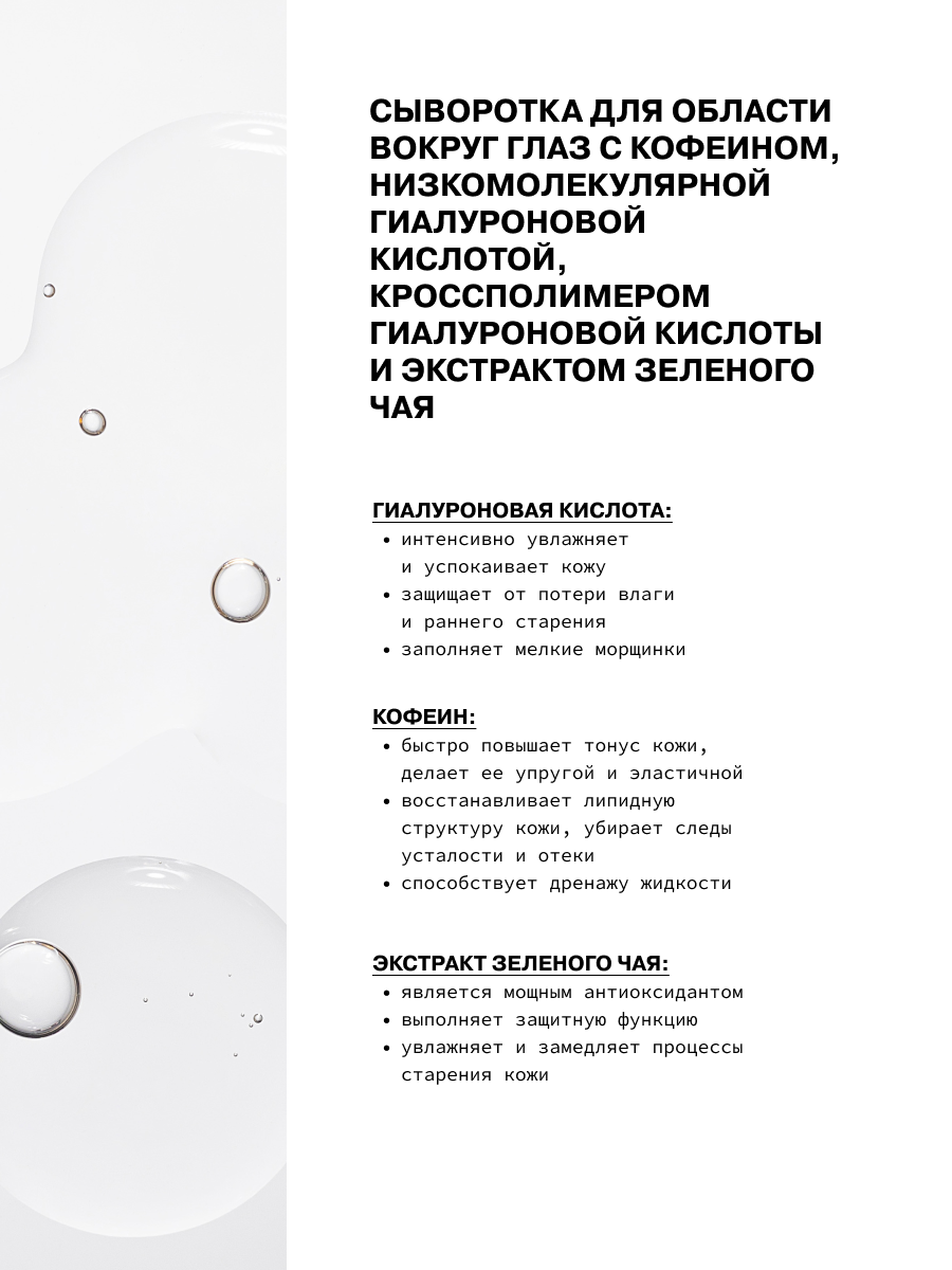 Сыворотка, в которой реальный ввод кофеина. Девочки, не пугайтесь, если увидеть стекло вату в пипетке-это кристаллы кофеина. Правильно погреть её перед использованием. Я ставлю в ёмкость, заливаю горячей водой, жду минутку и наношу. Если не греть, кофеин работать не будет. О самом средстве: отёки утренние и вправду снимает хорошо, но я перестала её использовать как сыворотку под крем, так как средства с кофеином мне очень сушат и стягивает кожу, какой бы потом питательный крем я не нанесла. Я грею сыворотку, наношу на область под глазами и сверху накладывают патч. Попробуйте так, метод очень действенный, из за окклюзии сыворотка работает лучше и мне не сушит. А помот можно и кремик для глаз нанести.