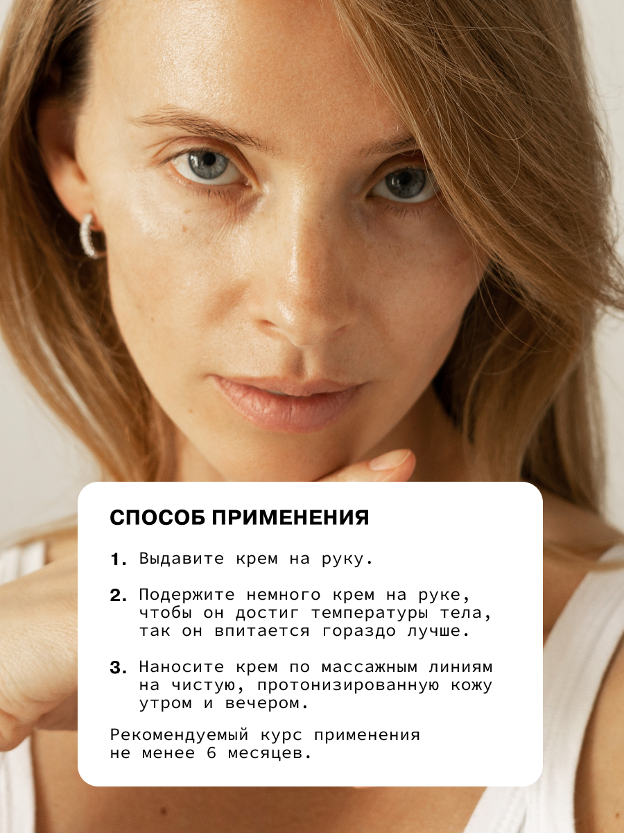 Наносить на чистую, протонизированную кожу утром и вечером. Рекомендуемый курс применения не менее 6 месяцев.