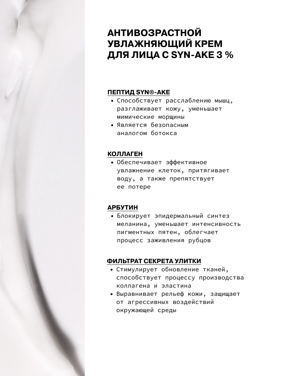 Syn-Ake - эффективный синтетический пептидный ингредиент, содержащийся в яде храмовой гадюки. Он быстродействующий, долговечный и обратимый. Расслабляет мимические мышцы лица, разглаживая морщины. Арбутин, в составе крема, обладает осветляющим действием. Коллаген создает на поверхности кожи влагоудерживающий слой и увлажняет кожу. Пептиды и антиоксиданты в составе секрета улитки стимулируют обновление тканей, производство коллагена и эластина, выравнивая рельеф кожи. "- борется с признаками старения;
