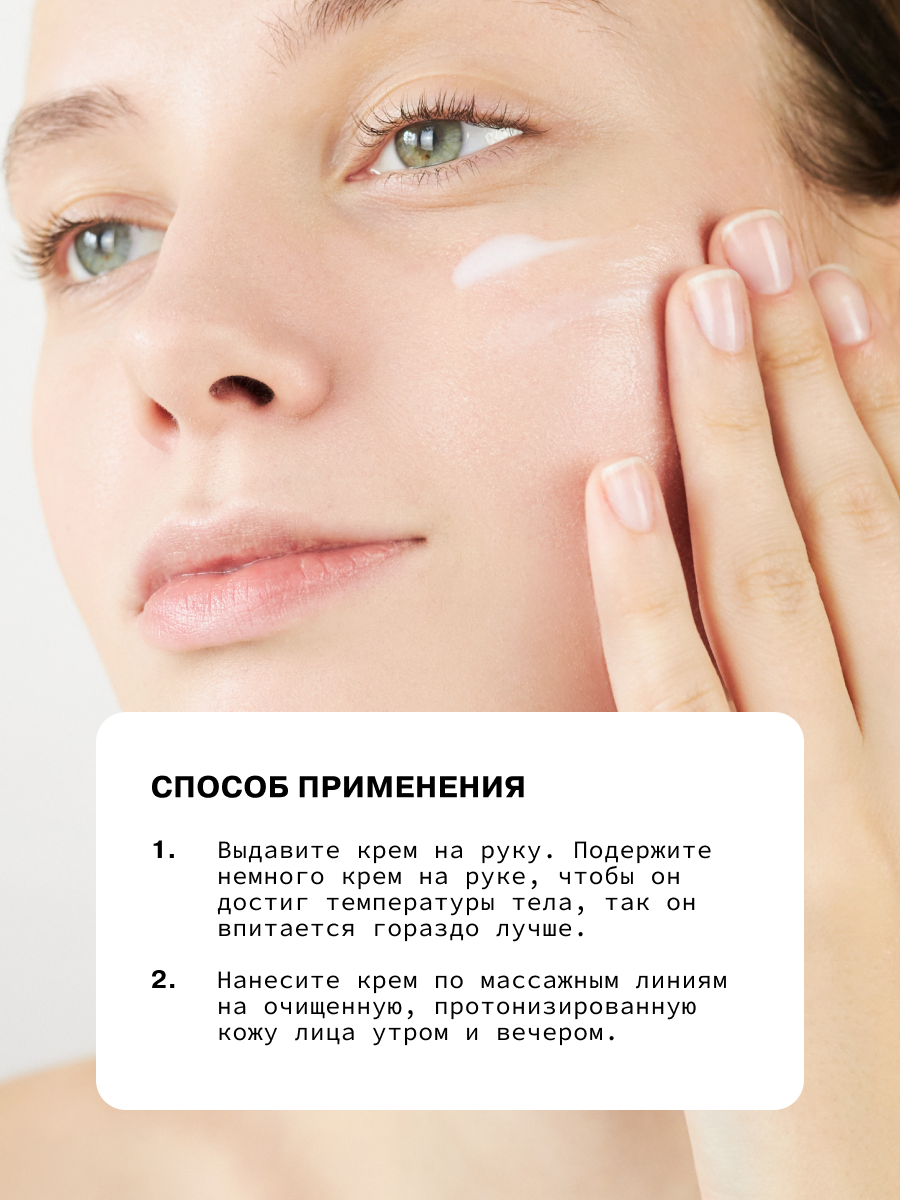 Наносить на очищенную, протонизированную, слегка влажную кожу в небольшом количестве утром и вечером.