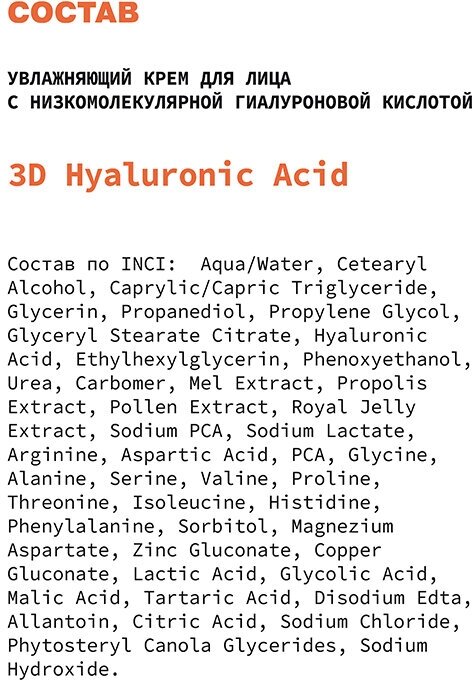 Состав: aqua/water, cеtearyl alcohol, caprylic/capric triglyceride, glycerin, propanediol, propylene glycol, glyceryl stearate citrate, hyaluronic acid, ethylhexylglycerin, phenoxyethanol, urea, carbomer, mel extract, propolis extract, pollen extract, royal jelly extract, sodium pca, sodium lactate, arginine, aspartic acid, pca, glycine, alanine, serine, valine, proline, threonine, isoleucine, histidine, phenylalanine, sorbitol, magnezium aspartate, zinc gluconate, copper gluconate, lactic acid, glycolic acid, malic acid, tartaric acid, disodium edta, allantoin, citric acid, sodium chloride, phytosteryl canola glycerides, sodium hydroxide.