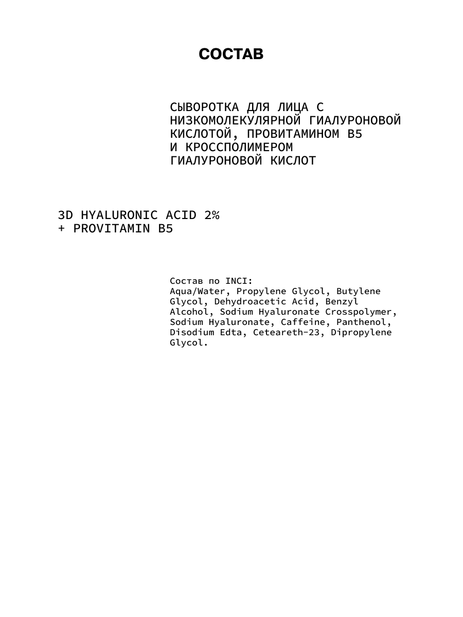 Состав: aqua/water, propylene glycol, butylene glycol, dehydroacetic acid, benzyl alcohol, sodium hyaluronate crosspolymer, sodium hyaluronate, caffeine, panthenol, disodium edta, ceteareth-23, dipropylene glycol.