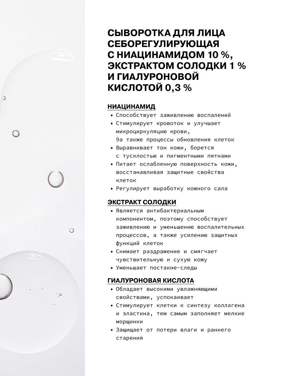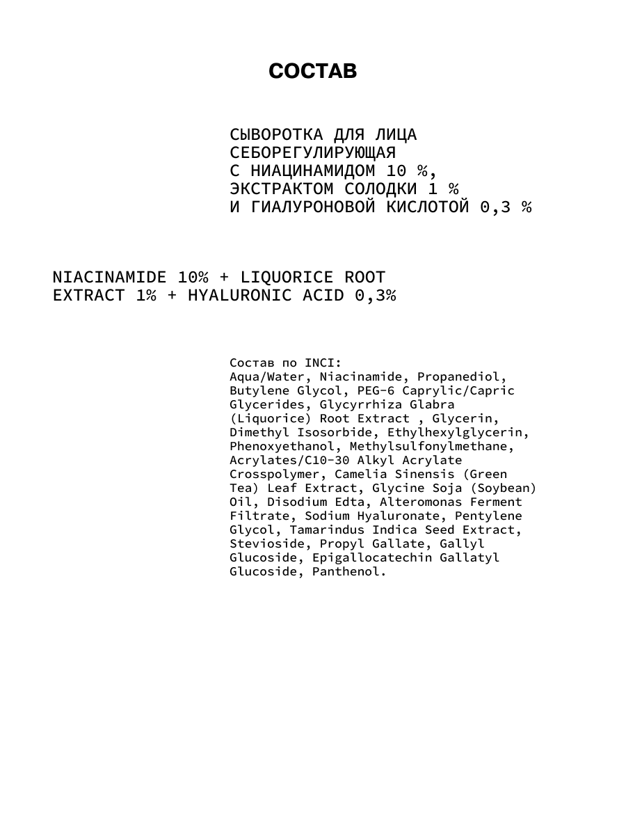 Ниацинамид является мультифункциональным компонентом. Он способствует стимуляции синтеза коллагена и улучшению защитных функций кожи, помогает снизить трансэпидермальную потерю влаги из кожи и уменьшить пигментацию. Солодка дополняет сыворотку осветляющим и мощным антиоксидантным действием. Для всех типов кожи.