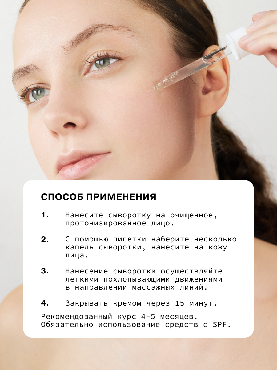 Наносить на очищенную протонизированную кожу, закрывать кремом через 15 минут. Рекомендованный курс 4–5 месяцев. Обязательно использование средств с SPF.