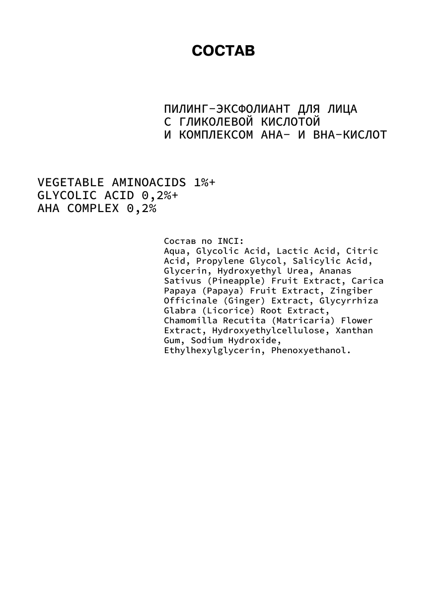 Состав: aqua/water, glycolic acid, glycerin, isononyl isononanoate, propanediol, potassium cetyl phosphate, butylene glycol, glyceryl stearate citrate, urea, ethylhexylglycerin, phenoxyethanol, polysorbate-20, pineapple extract, ginger extract, papaya extract, avocado extract, sorbitol, sodium lactate, sodium glycolate, sodium citrate, sodium malate, sodium tartrate, lactic acid, citric acid, malic acid, tartaric acid, acrylates/c10-30 alkyl acrylate, crosspolymer, disodium edta, cocamidopropyl dimethylamine, salicylic acid, tocopheryl acetate, sodium hydroxide.