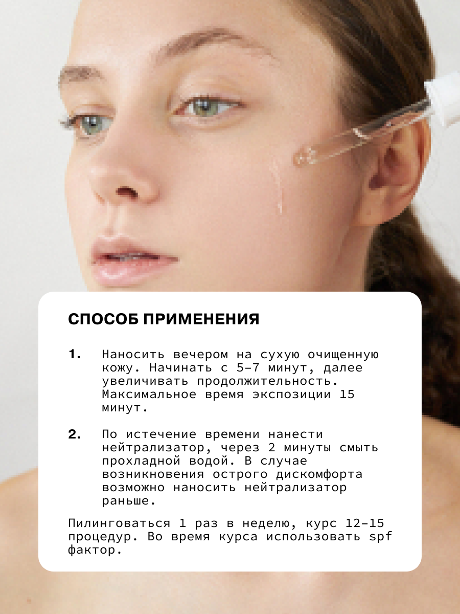Наносить вечером на сухую очищенную кожу. Начинать с 5–7 минут, увеличивать продолжительность. Максимальное время экспозиции 15 минут. По истечение времени нанести нейтрализатор, через 2 минуты смыть прохладной водой. В случае возникновения острого дискомфорта возможно наносить нейтрализатор раньше. Пилинговаться 1 раз в неделю, курс 12–15 процедур. Во время курса использовать spf фактор.