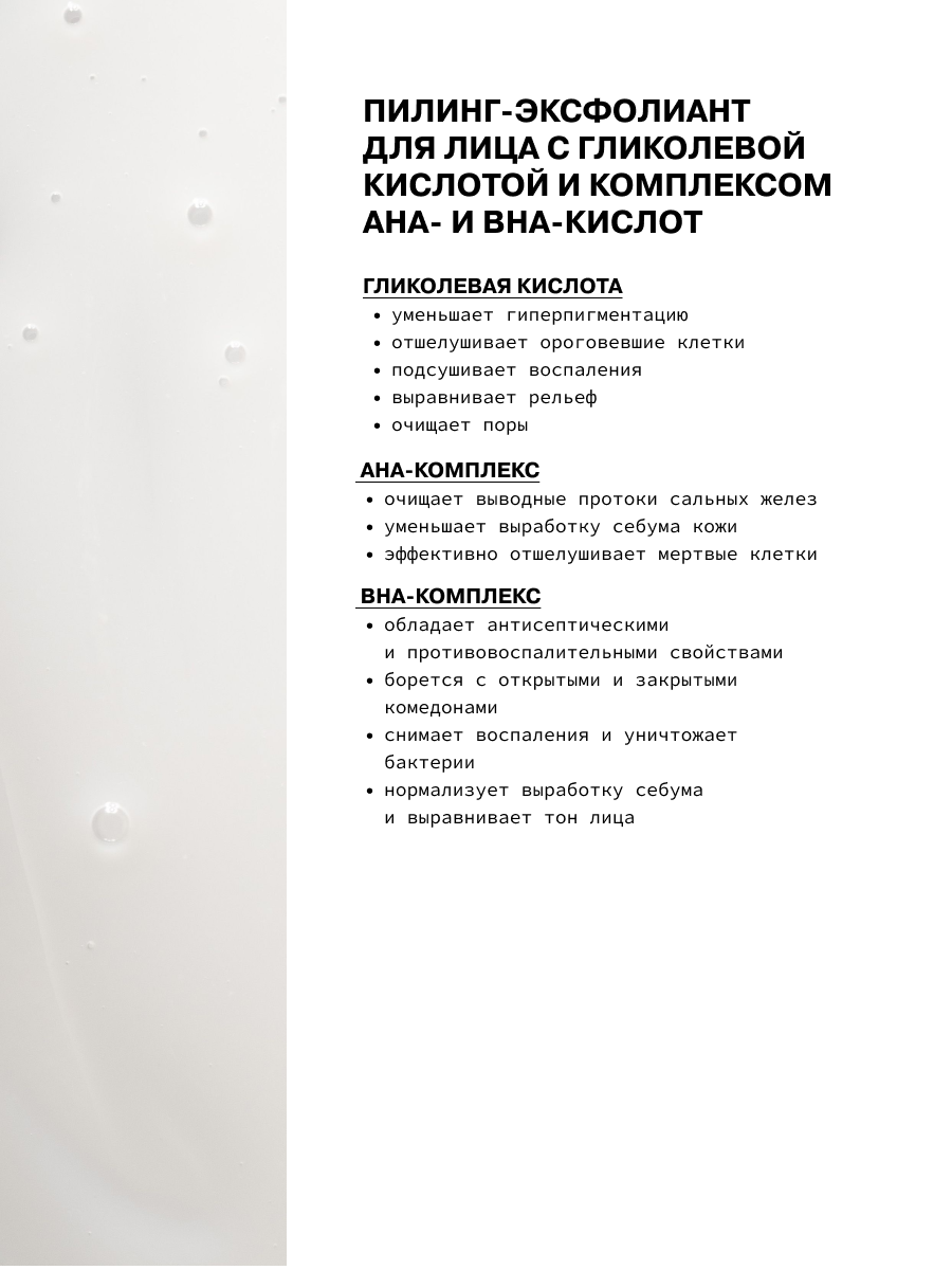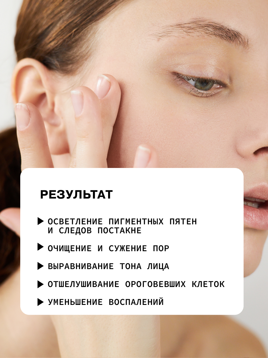 АНА-кислоты осветляют, увлажняют кожу, сужают поры и повышают синтез коллагена и эластина. Гликолевая и салициловая кислоты отшелушивают кожу и очищают поры. Для всех типов кожи.