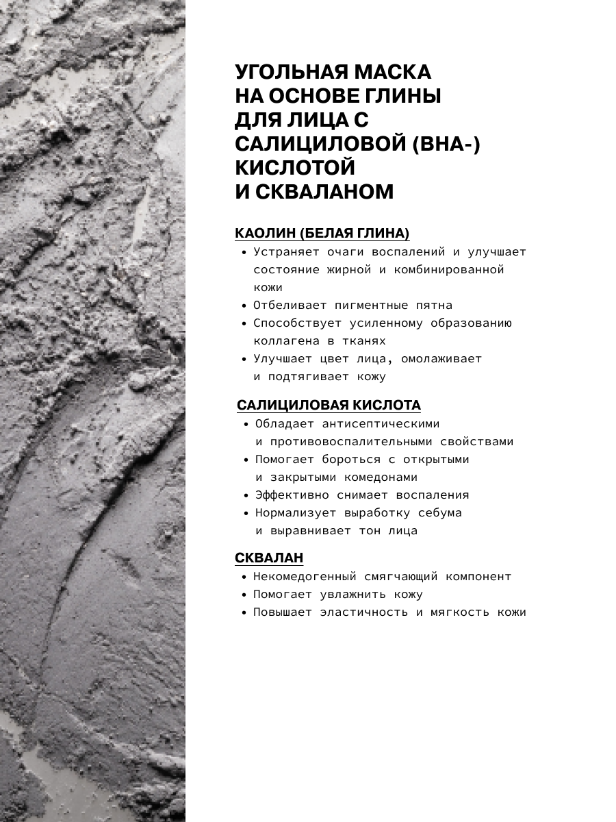 Маска на основе глины с салициловой кислотой и скваланом. Каолин обладает себорегулирующим действием и адсорбирует кожное сало из глубины пор. Салициловая кислота растворяет сальные пробки и отшелушивает кожу, делая ее поверхность более ровной. Сквалан смягчает кожу. Подходит для жирной и комбинированной кожи лица.