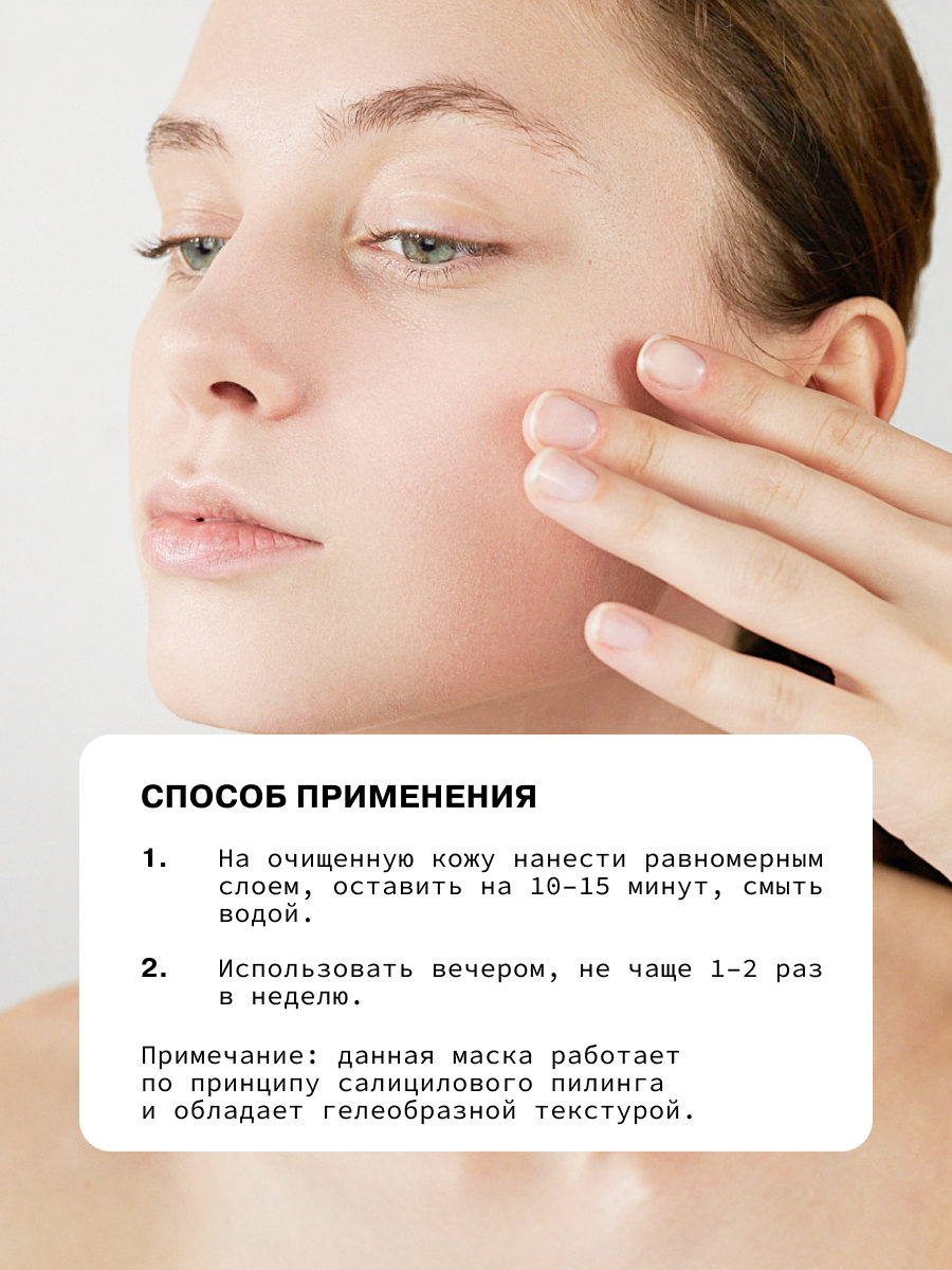 На очищенную кожу нанести равномерным слоем, оставить на 10–15 минут, смыть водой. Использовать вечером, не чаще 1–2 раз в неделю.