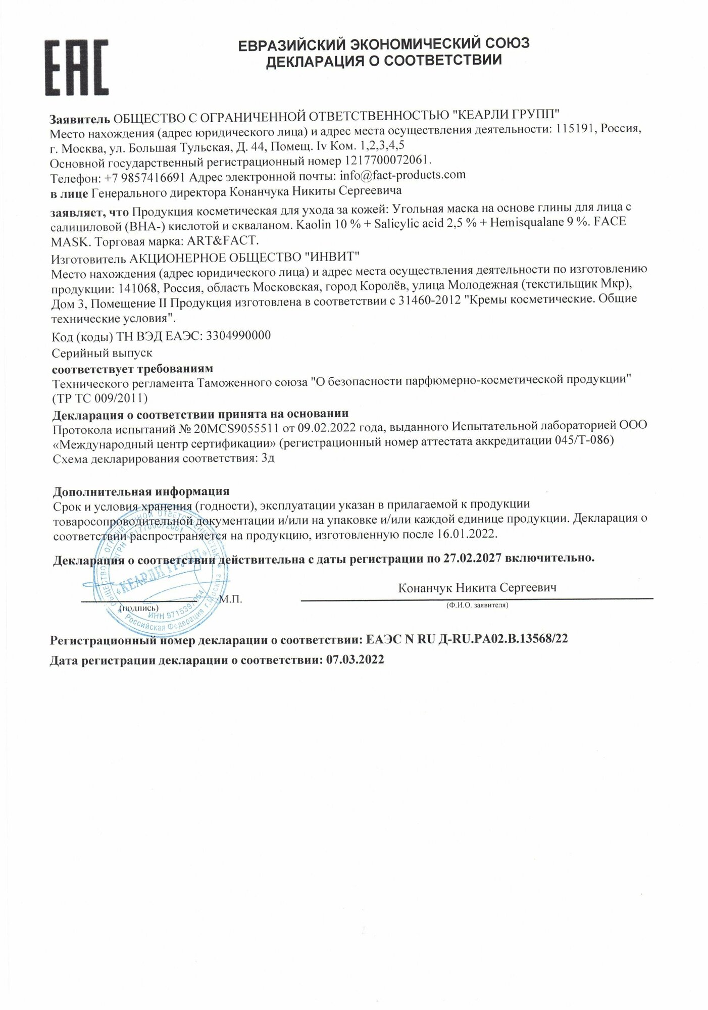 Art&Fact Угольная маска для лица Kaolin 10% + Salicylic Acid 25% + Hemisqualane 9% 50 мл (Art&Fact ) (ЭХ99989431677)