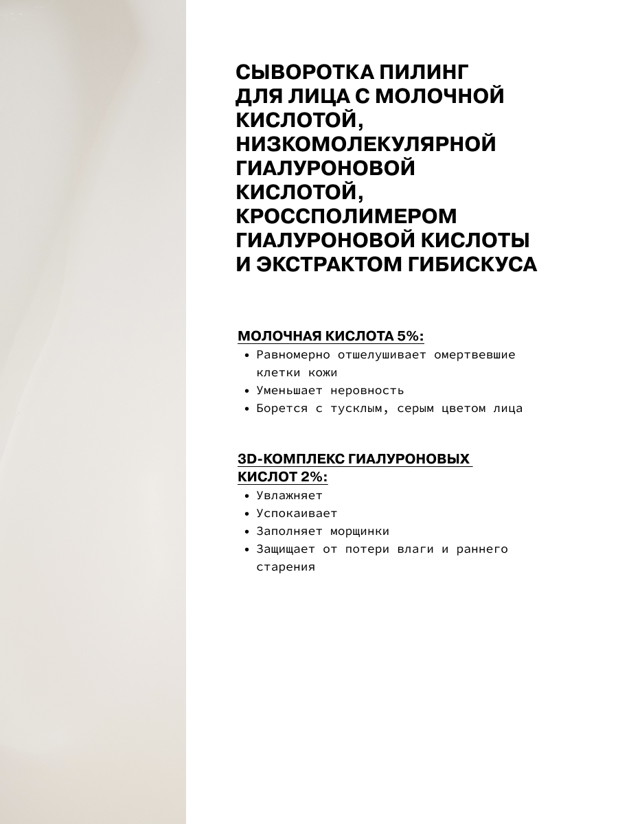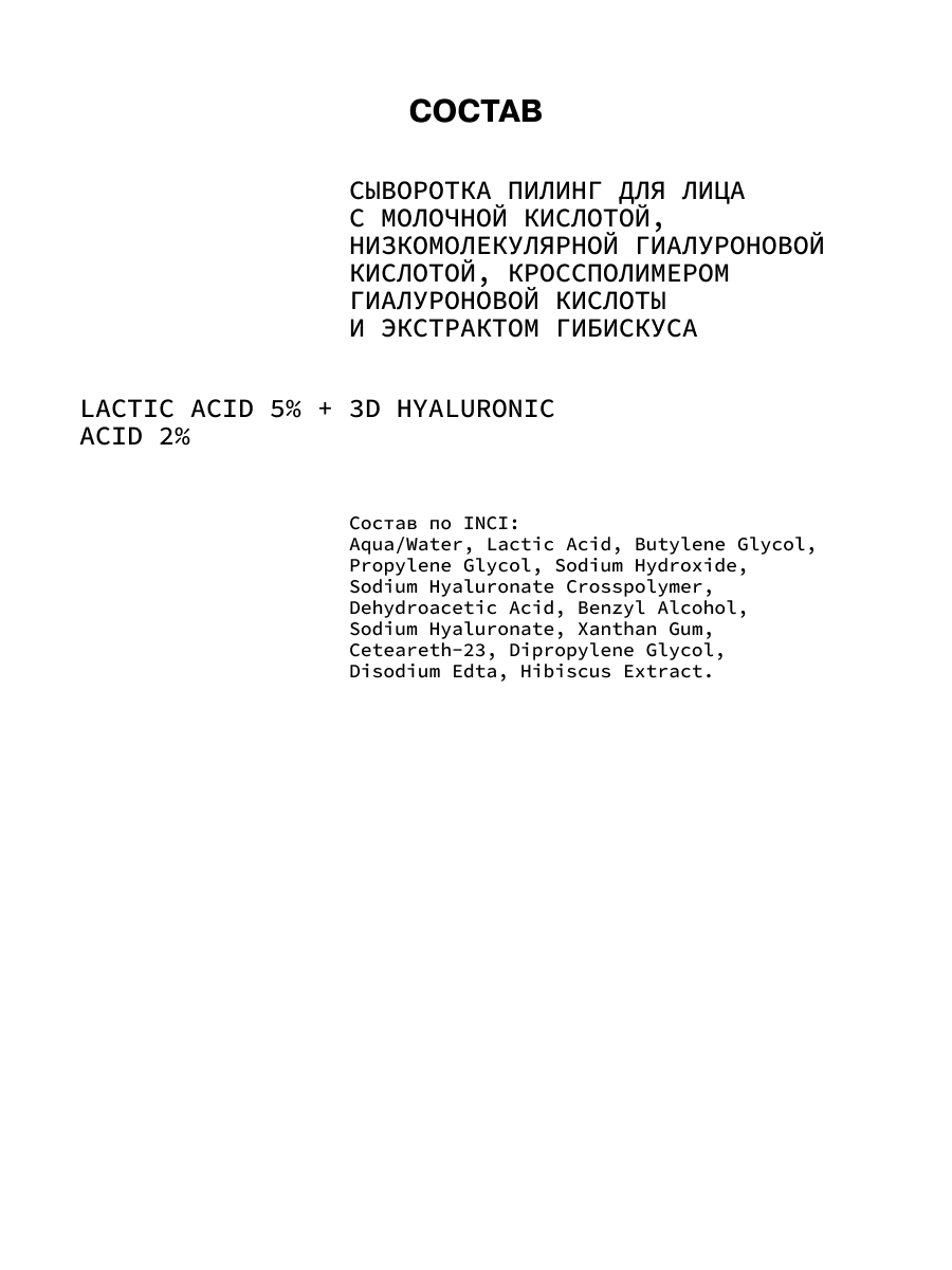 Молочная кислота — многозадачный компонент: выравнивает тон кожи, помогает в борьбе с фотостарением, ускоряет процесс клеточного обновления, стимулирует синтез коллагена. В комплексе с гиалуроновой кислотой становится мощным увлажнителем, который наполняет клетки кожи заветной влагой. Подходит для всех типов кожи.