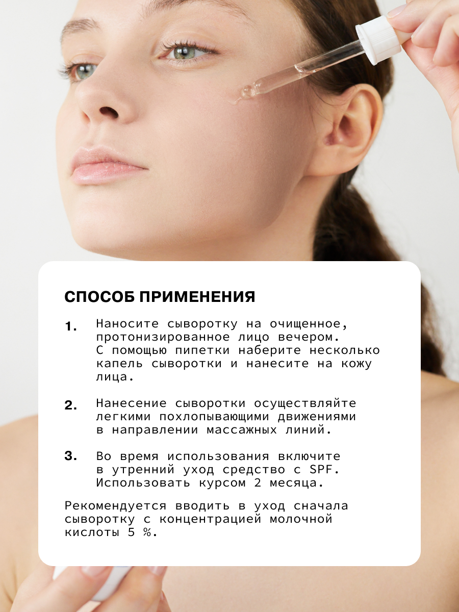 Наносить на очищенную, протонизированную кожу вечером. Использовать курсом 2 месяца. Во время использования включить в утренний уход средство с SPF. Рекомендуется вводить в уход сначала с использования сыворотки с концентрацией молочной кислоты 5%.