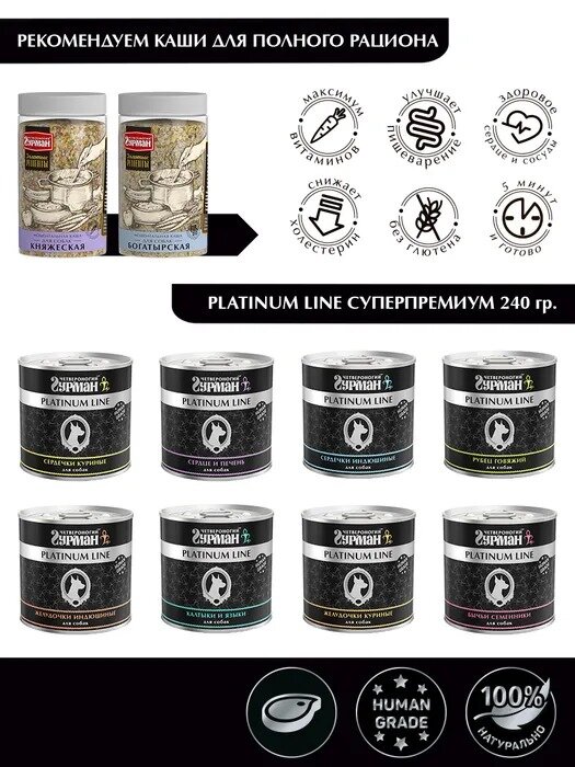 Четвероногий гурман “Platinum line” для собак – это деликатесное мясное лакомство суперпремиум класса. В каждой баночке содержатся исключительно цельные или крупно нарезанные субпродукты, которые так любят животные. Помимо привлекательного вкуса, все виды субпродуктов по–своему полезны – некоторые из них являются хорошим источником белка, другие содержат аминокислоты, витамины или коллаген.Многие субпродукты достаточно сложны в приготовлении, а данная линейка позволяет без хлопот и кропотливой готовки угостить собаку настоящими мясными лакомствами. Корм полностью натуральный – в его составе нет искусственных красителей, ароматизаторов, усилителей вкуса и ГМО.Консервы “Platinum line” подходят для собак всех пород для ежедневного кормления или как дополнение к основному рациону или вкусное угощение питомца.Помимо этого данные корма подходят для питомцев, которым показана строгая или монобелковая диета в связи с аллергией или проблемами чувствительного пищеварения.