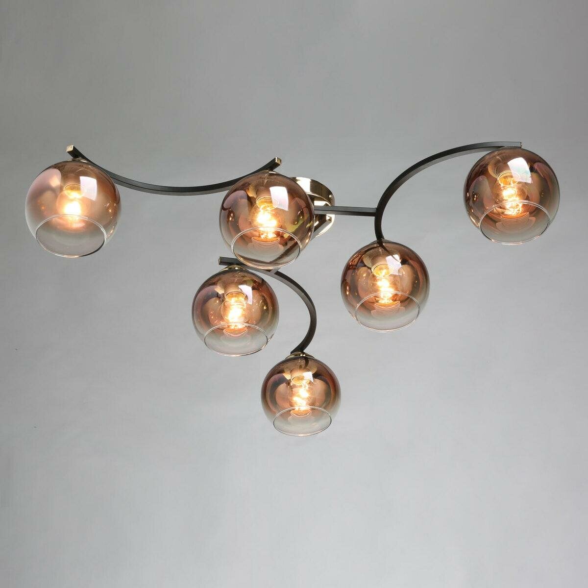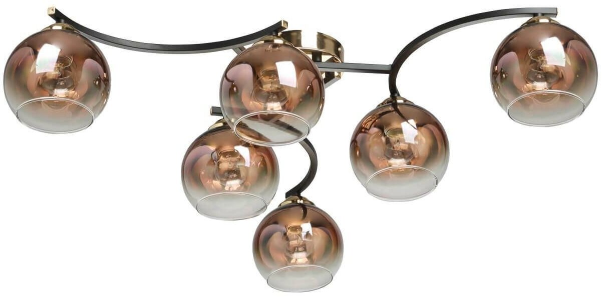 Потолочная люстра идеально подходит к стандартным потолкамСочетание черного и цвета бронзы эффектно выделяет люстру на потолкеСтеклянные плафоны вниз медного цвета создают комфортное освещение. Модный цвет меди плафонов и градиентное его нанесение привлекают к себе внимание, создают акцент на потолочной люстре.