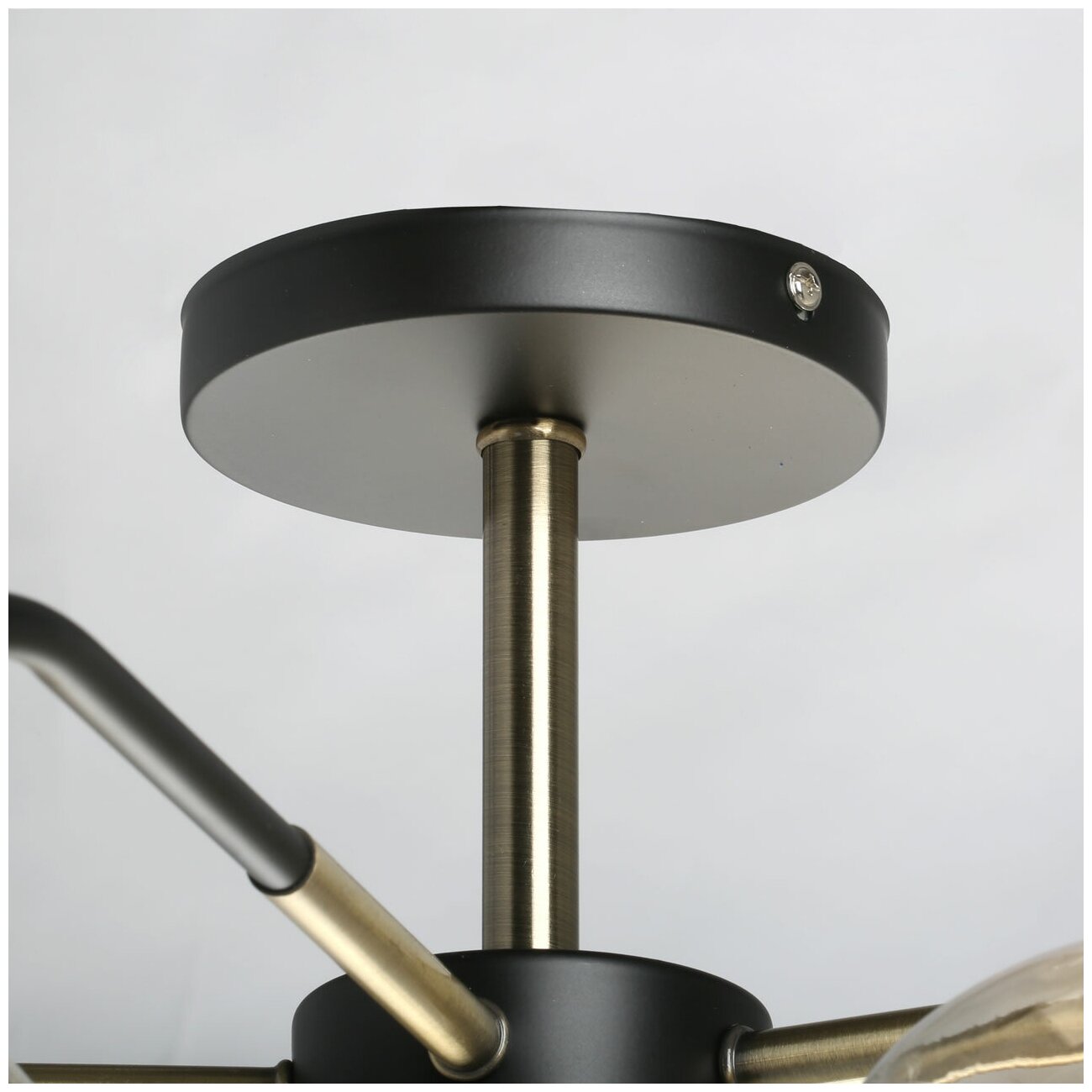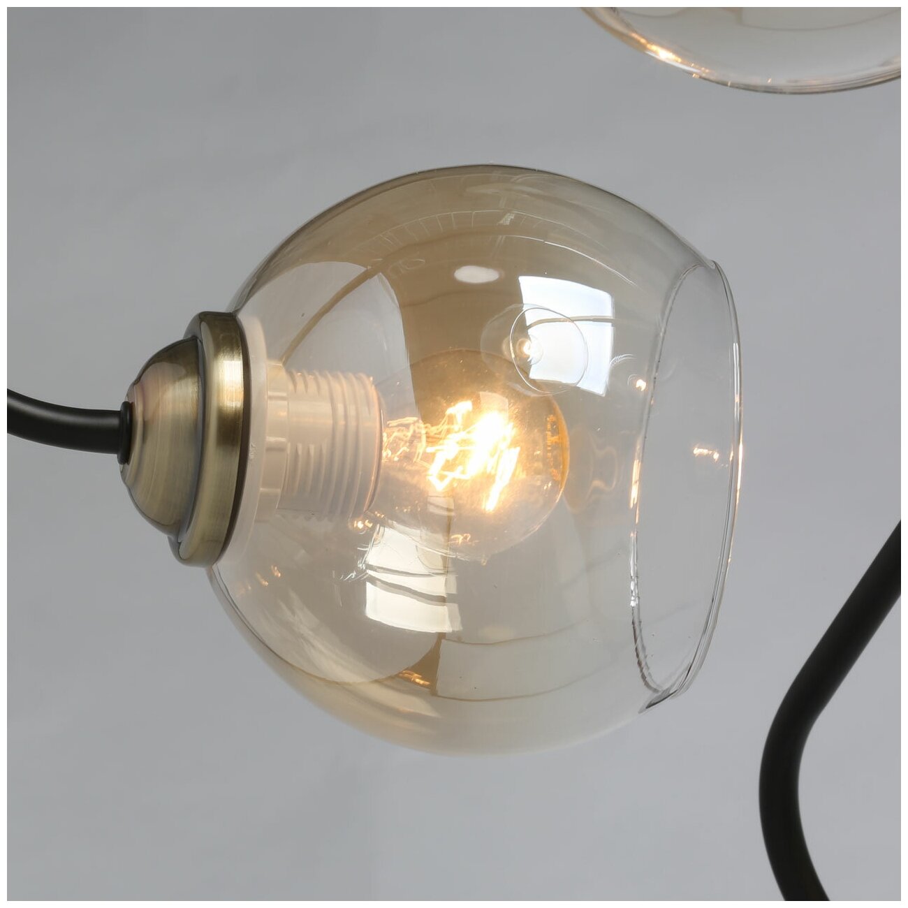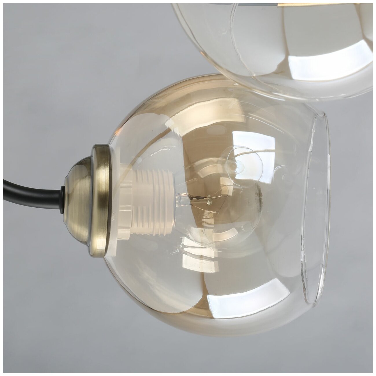 Металлическое основание потолочного светильника окрашено в черный цвет. Отдельные элементы гальванизированы в цвет бронзы. Стеклянные плафоны выдувные в форму гальванизированы в цвет шампань.