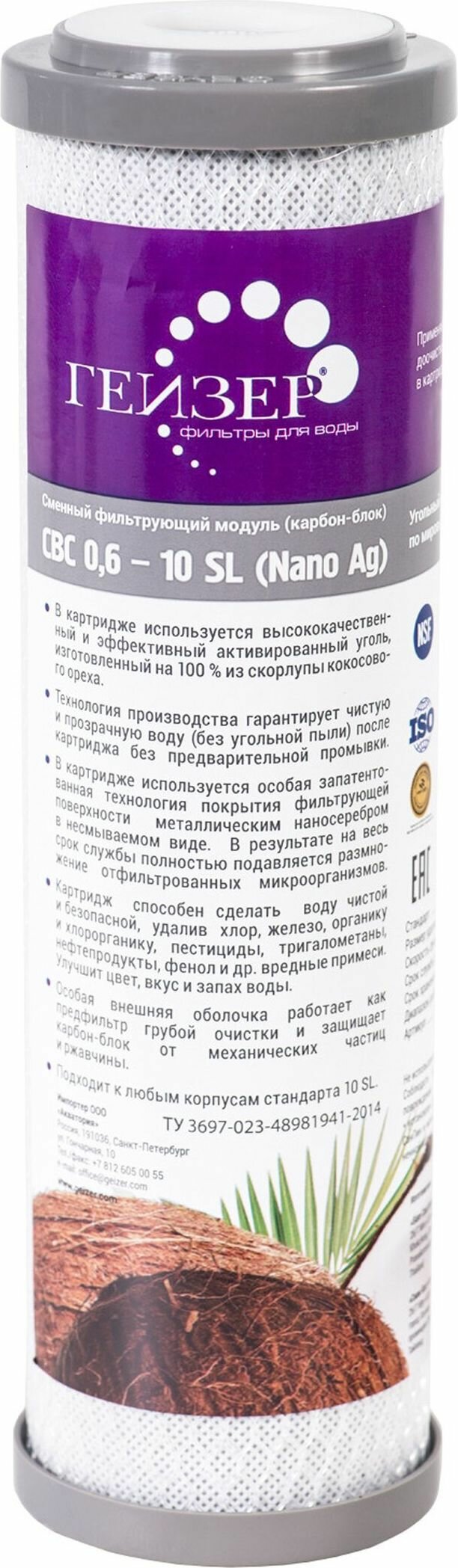 Картридж с увеличенным содержанием серебра для предотвращения размножения отфильтрованных бактерий и микроорганизмов. Выполнен из высококачественного кокосового активированного угля по технологии карбон блок. Имеет механический фильтр в виде пропиленовой сетки (5 мкм), исключающей прохождение наружу фильтрующих материалов. Картридж с увеличенным содержанием серебра для предотвращения размножения отфильтрованных бактерий и микроорганизмов.