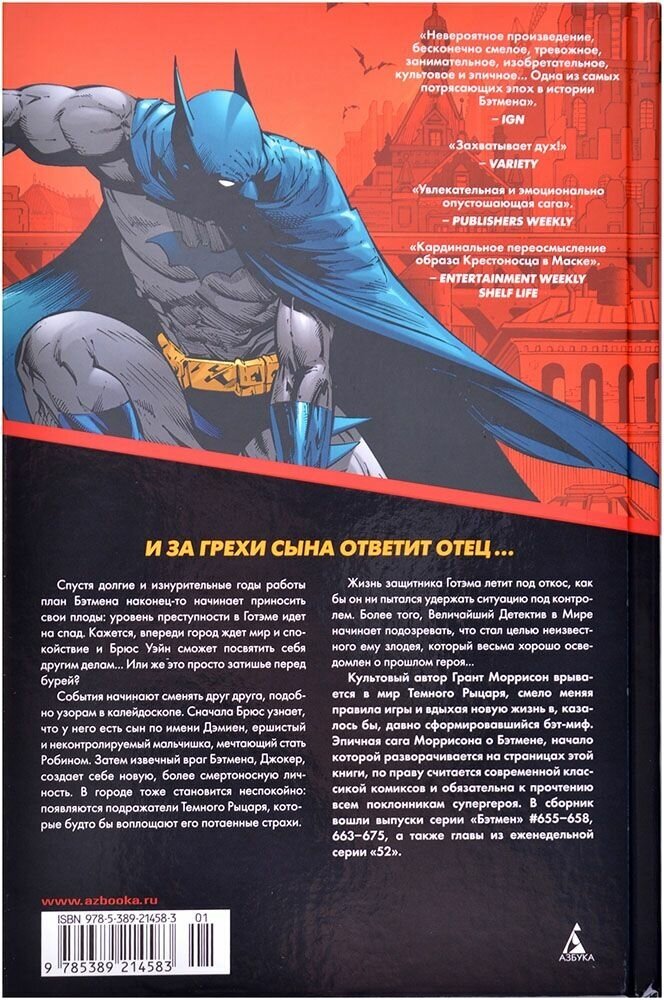 Ждал этот комикс на прилавках с момента анонса от издательства Азбука. Грант Моррисон является одним из лучших писателей комиксов, очень нравятся его работы. К тому же именно в этом комиксе автор знакомит читателей с сыном Брюса Уэйна, который впоследствии станет Робином, и так и останется неотъемлемым персонажем вселенной DC. Сюжет интересный, прочитал залпом. С нетерпением жду продолжение в уже анонсированном сборнике Бэтмен R.I.P